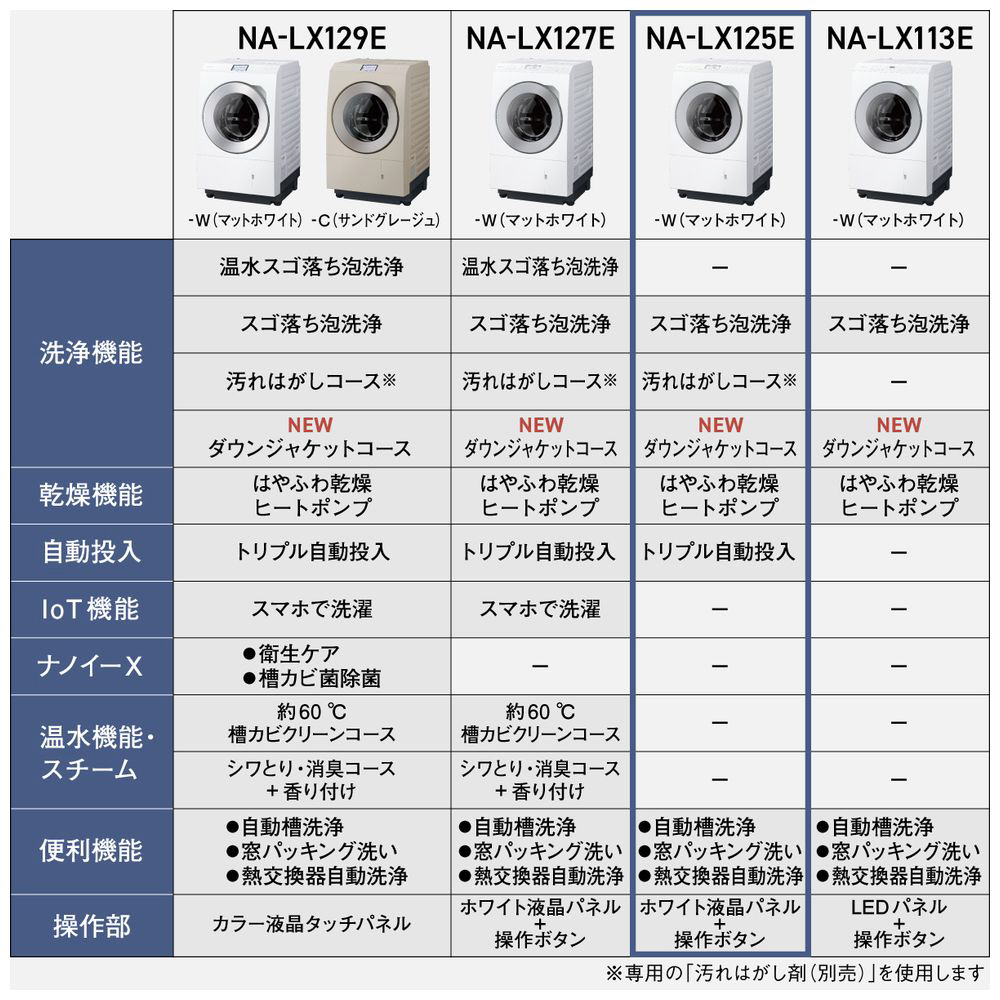 ※1 洗濯〜乾燥おまかせコース・定格洗濯乾燥6kg時。パナソニック2024年度モデルNA-LX125D(約960Wh)とNA-LX125E(約945Wh)の消費電力量比較。衣類の素材・入れ方・洗濯時の状況により、運転時間・消費電力量は前後します。