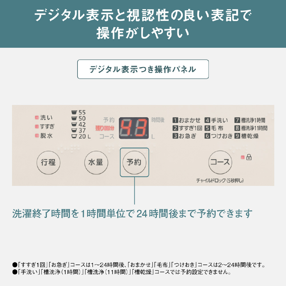 タイマー予約 1〜24時間後:すすぎ1回、お急ぎ  2〜24時間後:おまかせ、つけおき、毛布