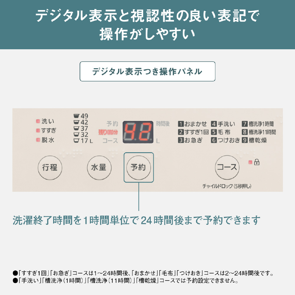 タイマー予約 1〜24時間後:すすぎ1回、お急ぎ  2〜24時間後:おまかせ、つけおき、毛布