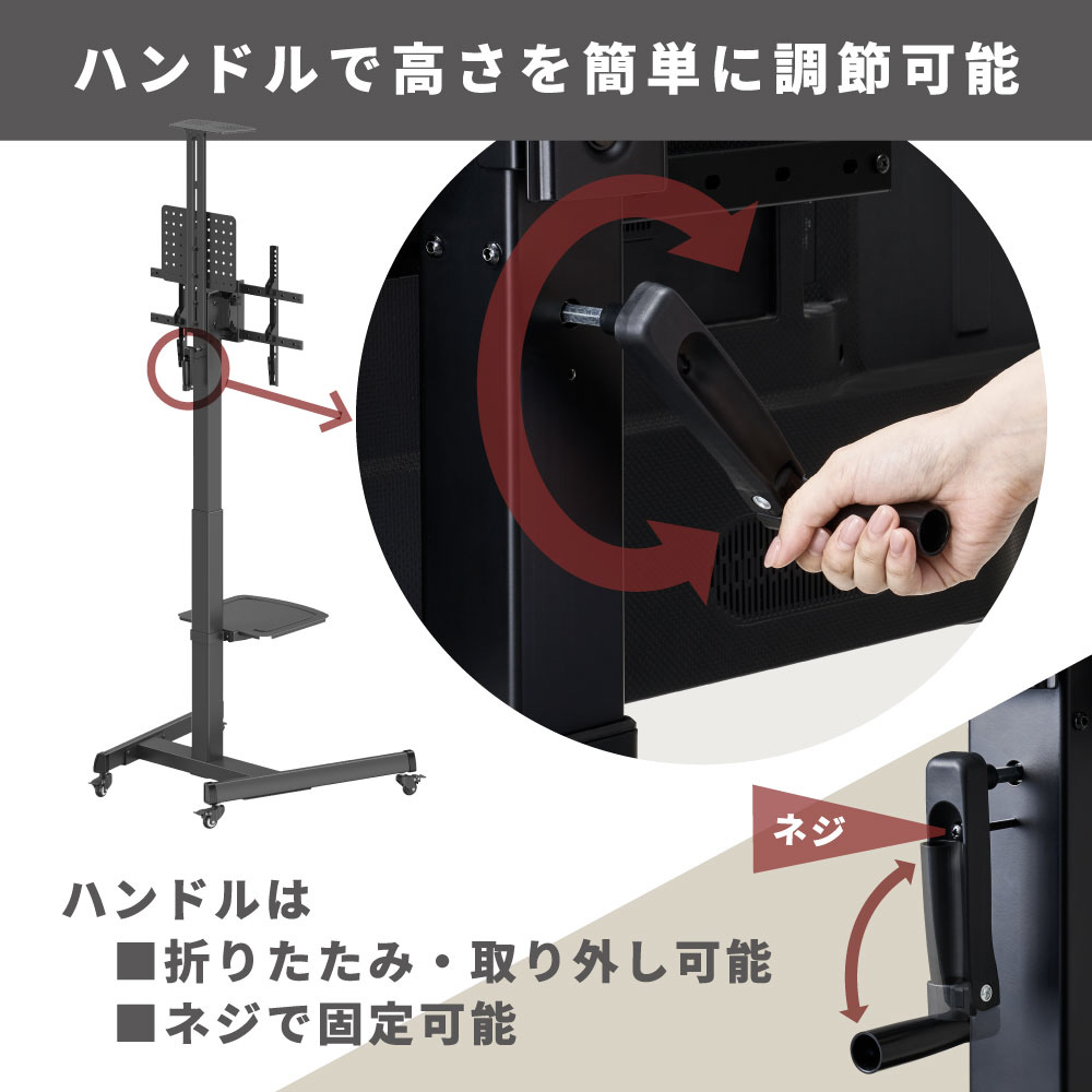 付属のハンドルを回すことでモニターの高さを自由に調整することができます。使用環境や目線に合わせて柔軟に設定できるのが特長です。ハンドルは取り外し可能で、いたずら防止にネジで固定しておくことも可能です。