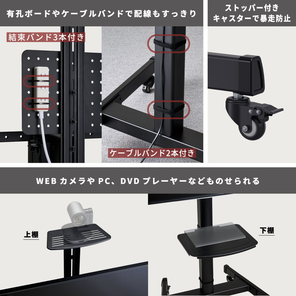 ストッパー付きキャスターを採用しており、移動時はスムーズに、設置時はしっかり固定できて安心です。さらに、有孔ボードとケーブルバンド(2本)、結束バンド(3本)が付属しており、周辺機器や配線をすっきり整理することができます。