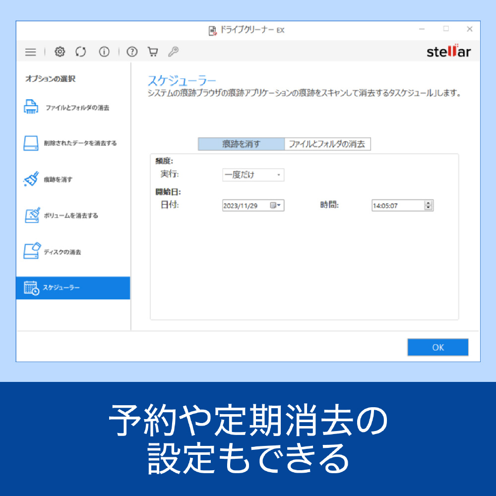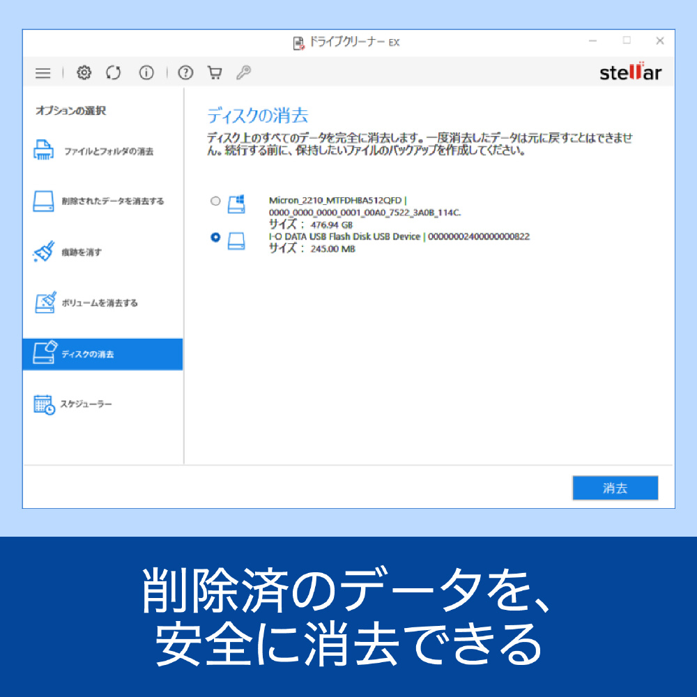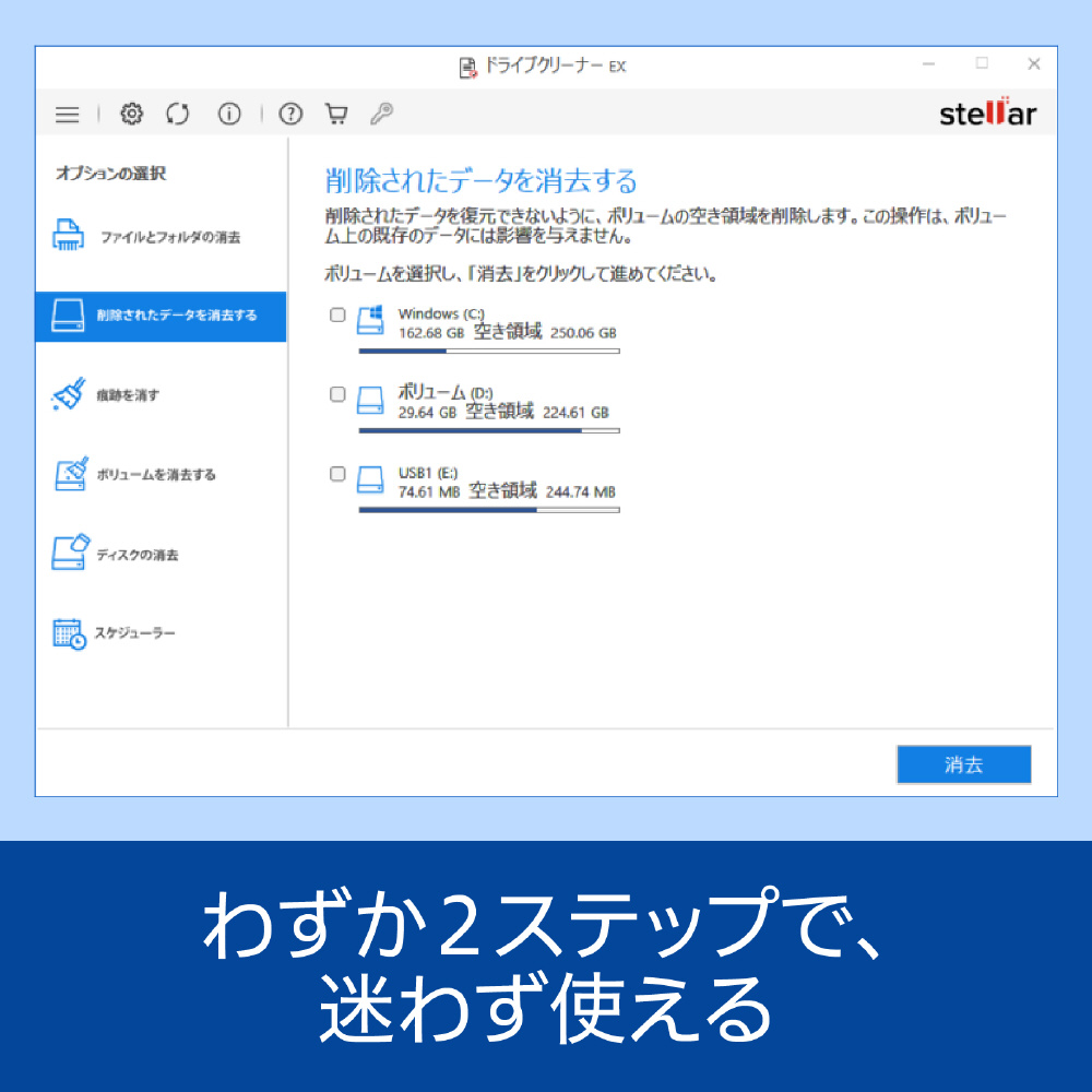 データ復元や消去の分野で世界有数の企業であるStellar社が開発したソフトです。国家機密レベルのデータ消去技術を含む3つの消去レベルを選択できます。