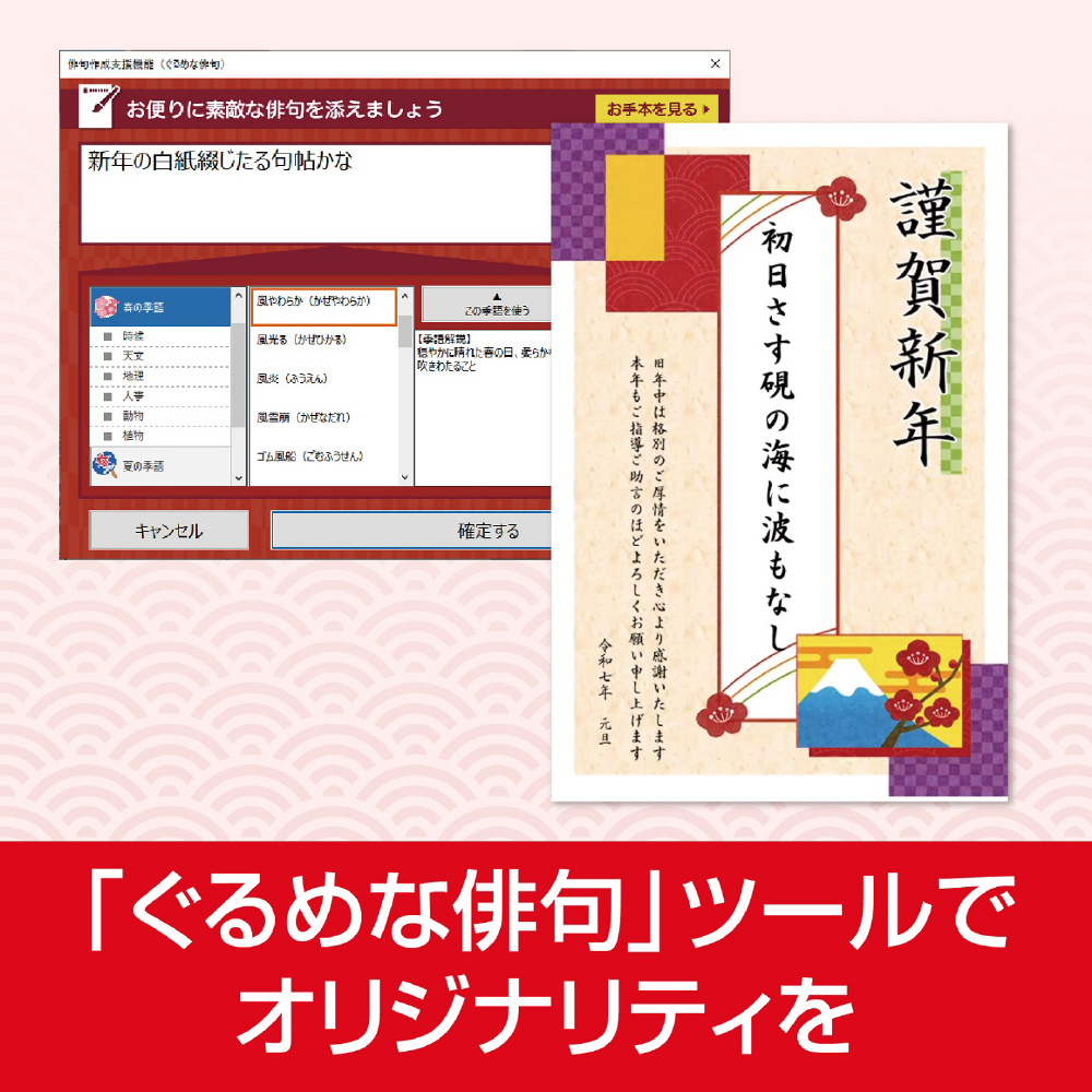 季語集を搭載した”ぐるめな俳句”を使って俳句を作成できます。作った俳句は年賀状のデザインに取り込めます。