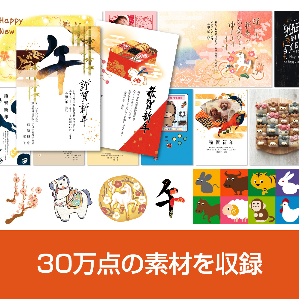 2026年用の午年デザインや十二支の素材、年中使えるデザインを収録。直感的に選べる「素材パレット」で好みのデザインもすぐ見つかります。