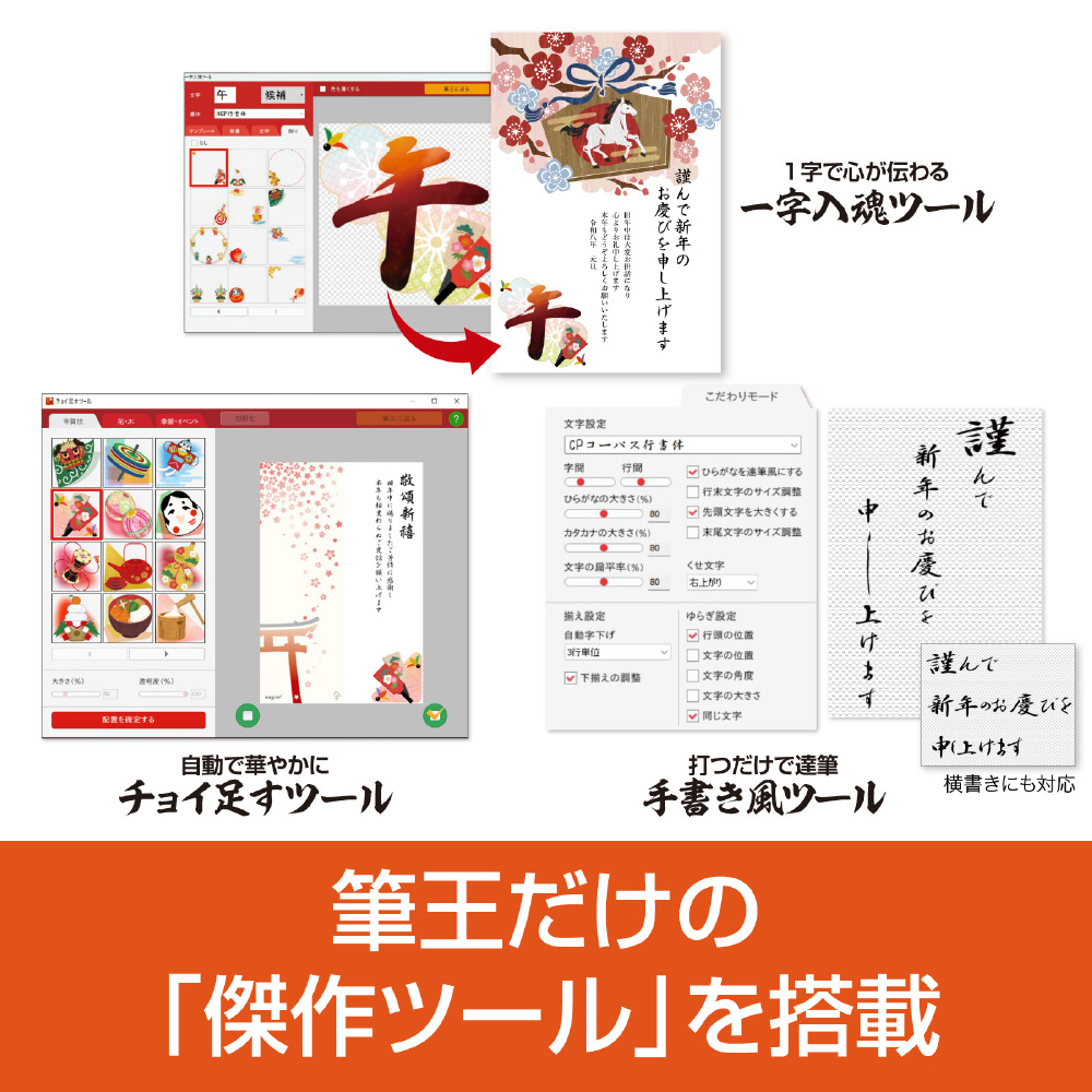 「筆王」は高品質な年賀状をラクに作れる手頃な年賀状ソフトです。そのまま使える素材30万点に加え、オリジナルのデザインを作れるツールとPDFガイドブックなども収録し、初めてにも乗換の方にもおすすめです。