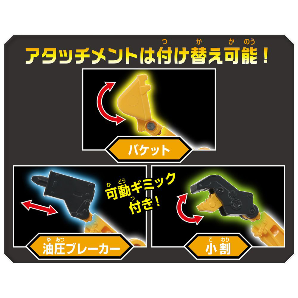 3種のアタッチメント「バケット」「油圧ブレーカー」「小割」が付属!