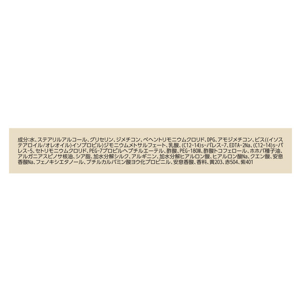 水、ステアリルアルコール、グリセリン、ジメチコン、ベヘントリモニウムクロリド、DPG、アモジメチコン、ビス((イソステアロイル/オレオイル)イソプロピル)ジモニウムメトサルフェート、乳酸、(C12-14)s-パレス-7、EDTA-2Na、(C12-14)s-パレス-5、セトリモニウムクロリド、PEG-7プロピルヘプチルエーテル、酢酸、PEG-180M、酢酸トコフェロール、ホホバ種子油、アルガニアスピノサ核油、シア脂、加水分解シルク、アルギニン、加水分解ヒアルロン酸、ヒアルロン酸Na、クエン酸、安息香酸Na、フェノキシエタノール、ブチルカルバミン酸ヨウ化プロピニル、安息香酸、香料、黄203、赤504、紫401