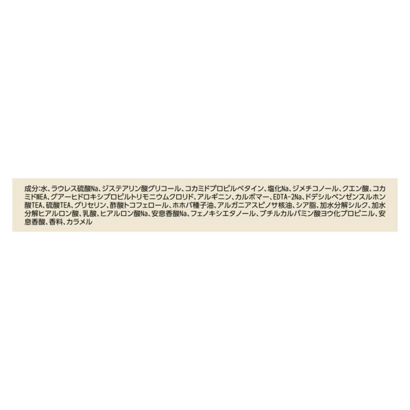 水、ラウレス硫酸Na、ジステアリン酸グリコール、コカミドプロピルベタイン、塩化Na、ジメチコノール、クエン酸、コカミドMEA、グアーヒドロキシプロピルトリモニウムクロリド、アルギニン、カルボマー、EDTA-2Na、ドデシルベンゼンスルホン酸TEA、硫酸TEA、グリセリン、酢酸トコフェロール、ホホバ種子油、アルガニアスピノサ核油、シア脂、加水分解シルク、加水分解ヒアルロン酸、乳酸、ヒアルロン酸Na、安息香酸Na、フェノキシエタノール、ブチルカルバミン酸ヨウ化プロピニル、安息香酸、香料、カラメル
