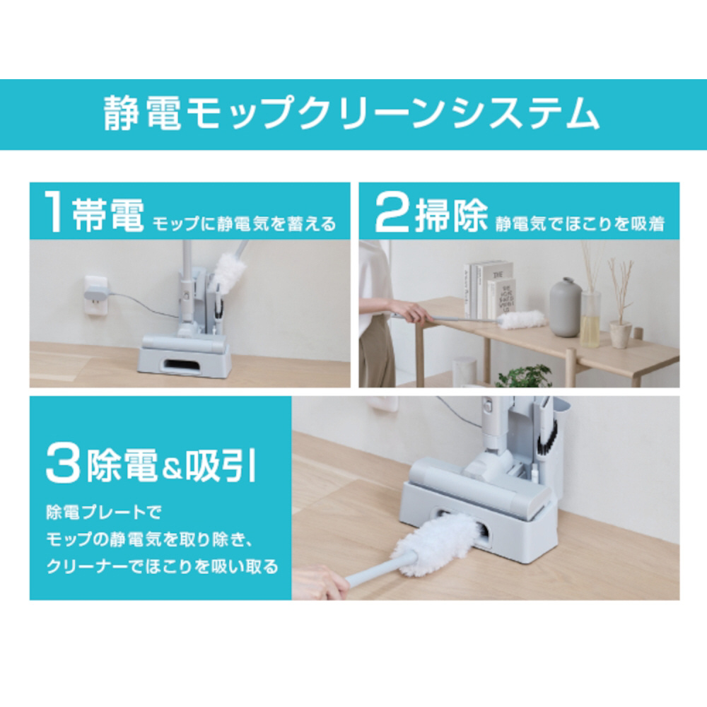■アイリスオーヤマ独自技術「静電モップクリーンシステム搭載」。モップ帯電ケースで静電気を帯電させ、ほこりを吸着、クリーナーで吸引するから何度も使えて経済的です。