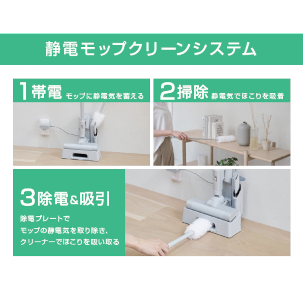 ■アイリスオーヤマ独自技術「静電モップクリーンシステム搭載」。モップ帯電ケースで静電気を帯電させ、ほこりを吸着、クリーナーで吸引するので何度も使えて経済的です。