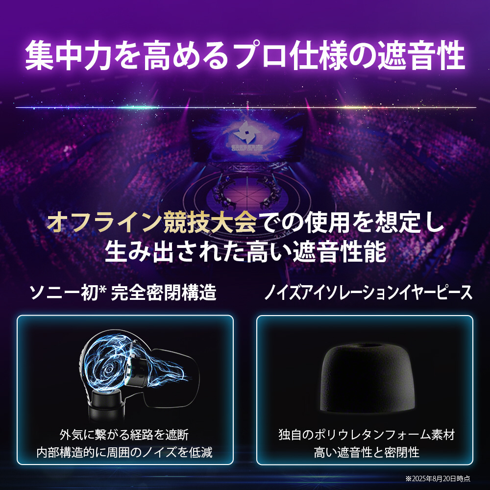 ソニー初の「完全密閉構造」と、独自開発ポリウレタンフォーム素材を使用した「ノイズアイソレーションイヤーピース」の組み合わせにより優れた遮音性を実現。有観客の競技大会での使用を想定し設計された優れた遮音性で、周囲の環境ノイズを低減し、戦闘中の僅かな足音や銃声などの感知をサポートします。