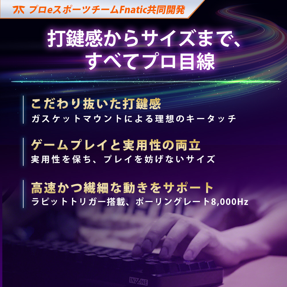 多くの国際大会で優勝を収め、世界的に絶大な人気を誇るeスポーツチームFnaticと密に協力し共同開発を実施。コンパクトな筐体設計から、打鍵感、エルゴノミクスに基づいた微調整に至るまで様々な決定を彼らと行った結果、最大限の競技パフォーマンスを発揮できるプロ仕様のゲーミングキーボードが誕生しました。