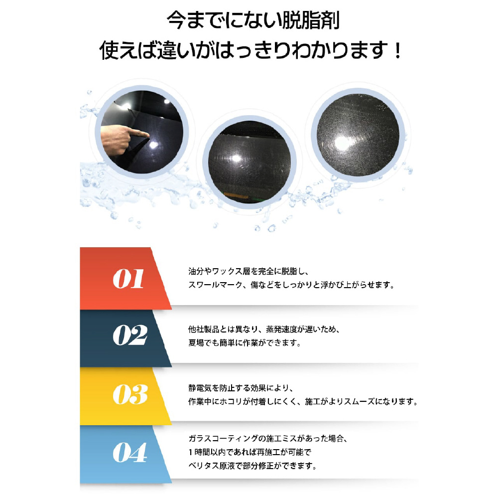 ・油分やワックス層を完全に脱脂し、スワールマーク、傷などをしっかりと浮かび上がらせます。