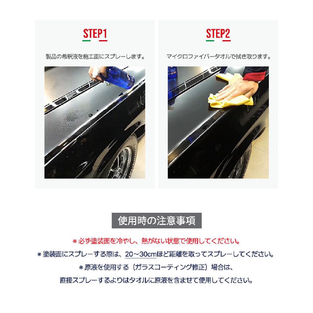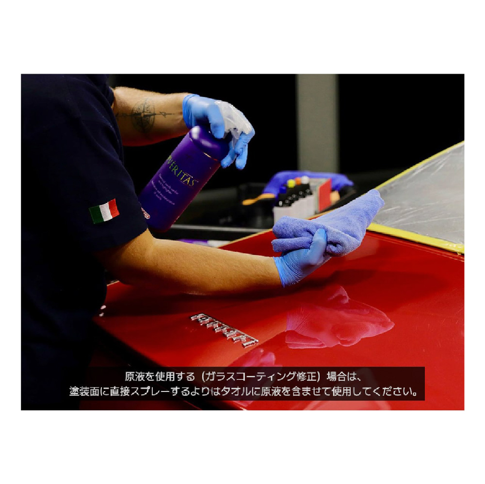 ガラスコーティング修正のために原液を使用する場合は、直接スプレーするよりタオルに原液を含ませて使用してください。