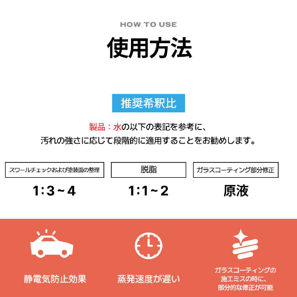 ワックス、シーラントを完全に除去。塗装面の残留物を除去。静電気防止効果。