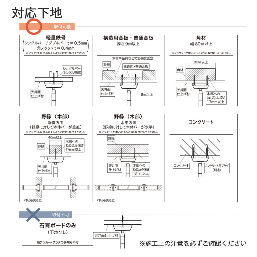 ※ブラケットは木下地、軽量鉄骨下地、コンクリート下地がある位置に取付けてください。
