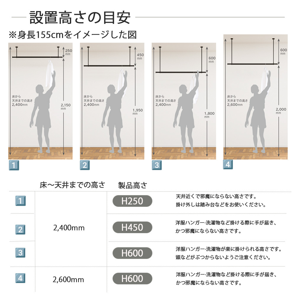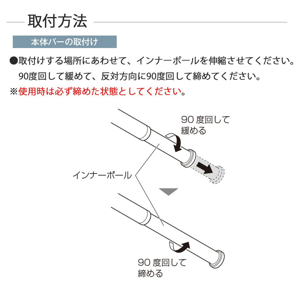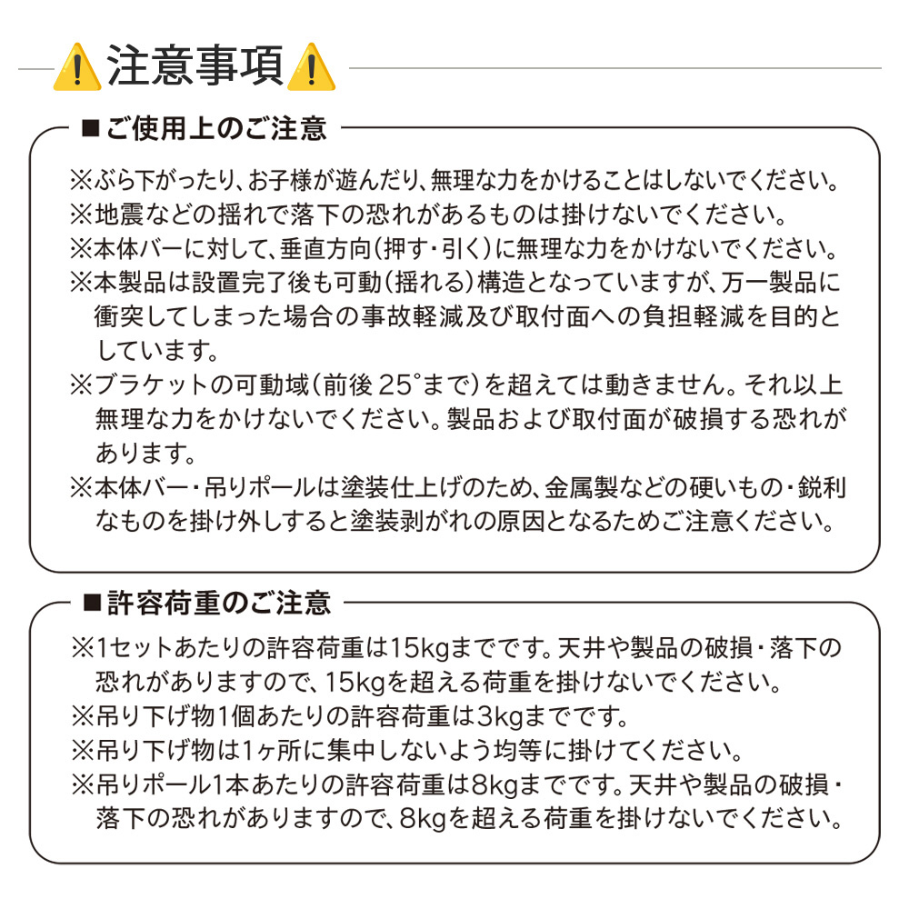 ※本体バー・吊りポールは塗装仕上げのため、金属製などの硬いもの・鋭利なものを掛け外しすると塗装剥がれの原因となるためご注意ください。