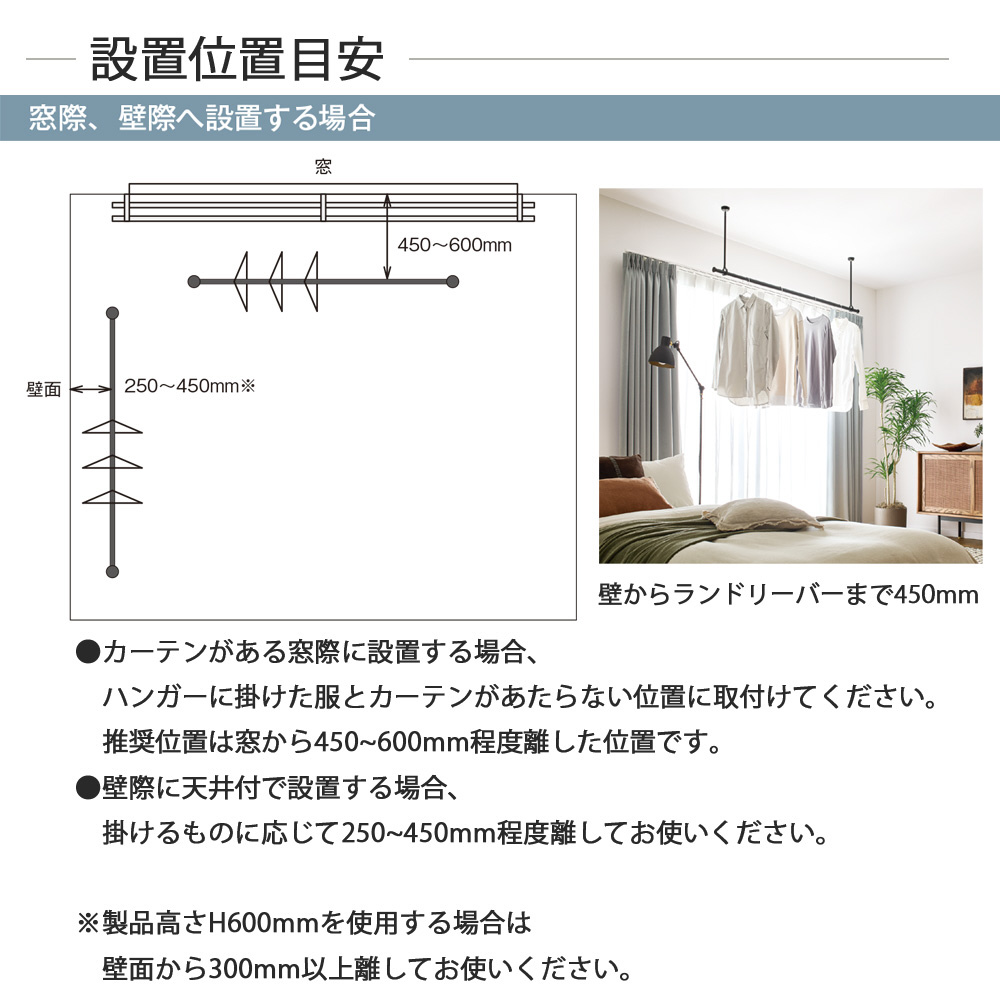 ●空間になじむマットな質感: 主要パーツはマットな塗装仕上げ。室内物干しの存在感を与えず、インテリアの一部として溶け込みます。