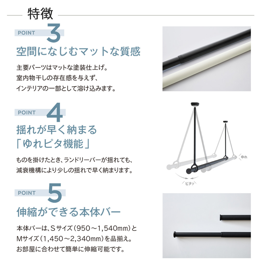 ●揺れが早く納まる「ゆれピタ機能」: ものを掛けたとき、ランドリーバーが揺れても、減衰機構により少しの揺れで早く納まります。