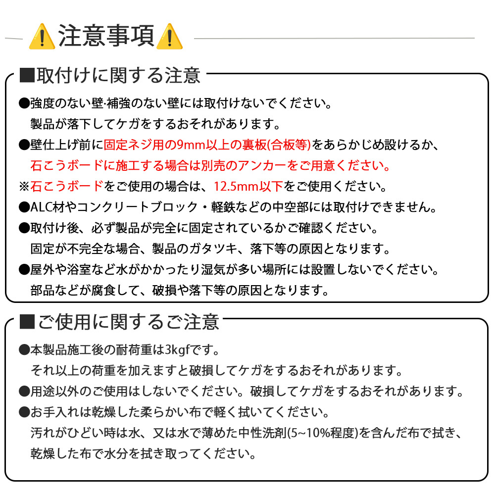 ●石膏ボードをご使用の場合は、12.5mm以下をご使用ください。アンカーを使用する際は別途アンカーに付属する取扱説明書をご確認ください。