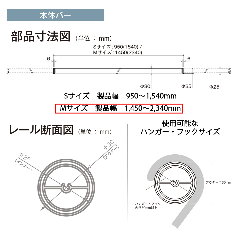 ●伸縮ができる本体バー: 本体バーは、Sサイズ(950~1,540mm)とMサイズ(1,450~2,340mm)を品揃え。お部屋、用途に合わせて簡単に伸縮可能です。