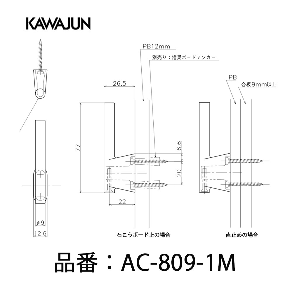●石膏ボードをご使用の場合は、12.5mm以下をご使用ください。アンカーを使用する際は別途アンカーに付属する取扱説明書をご確認ください。