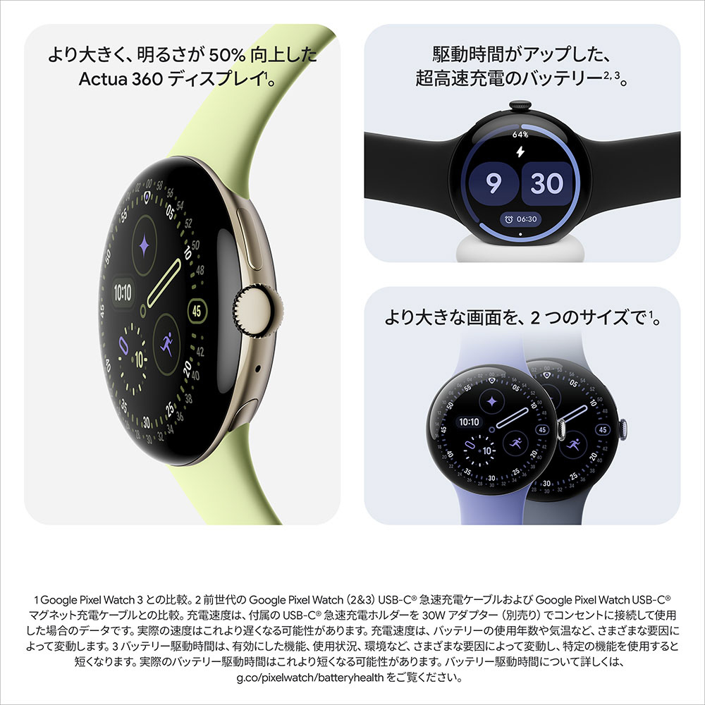 Google Pixel Watch 4 ではバッテリーを全面的に見直し、シリーズ最短の充電時間と最長の駆動時間を実現しました。