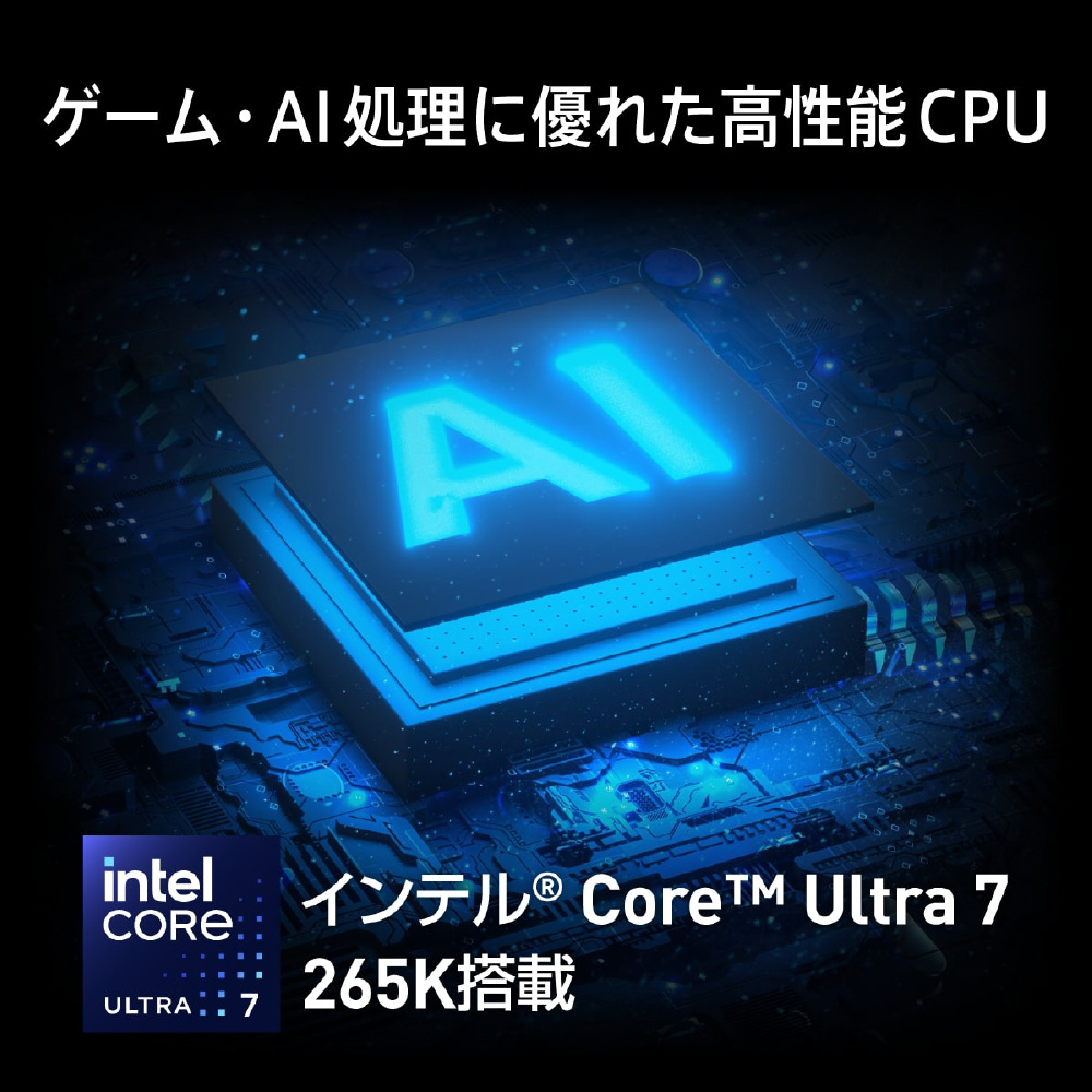 アーキテクチャ刷新により、新たにAI処理に特化したNPUを搭載したIntel Ultra 7 265Kで、ゲームはもちろんAI機能を活用したい方にもお勧めです。