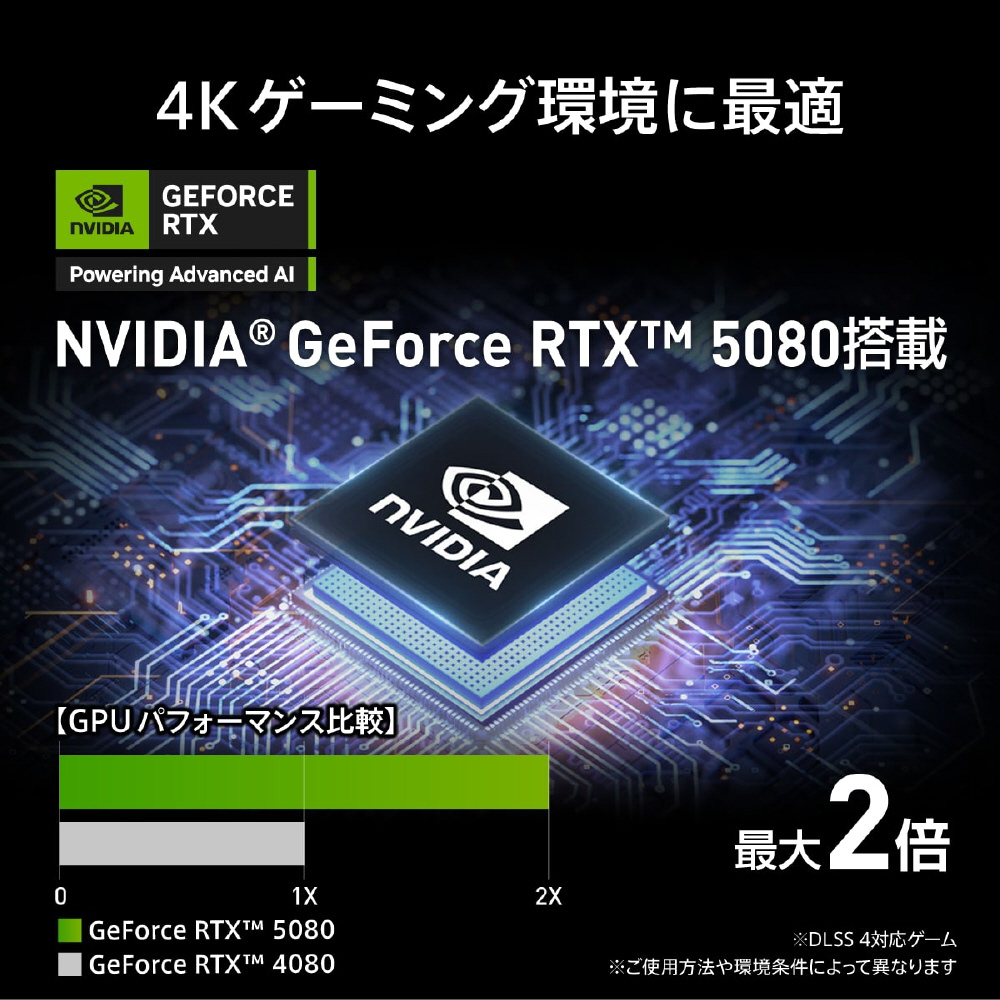 NVIDIA GeForce RTX 5080を搭載し、4K解像度に対応したゲーミングモニターで快適にプレイが可能です。