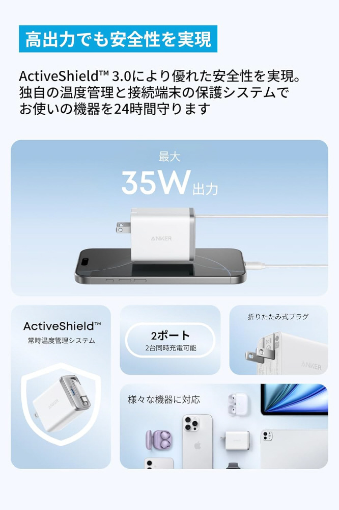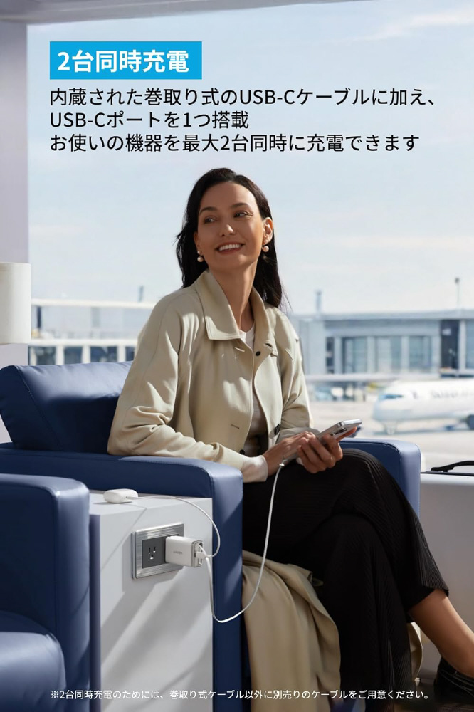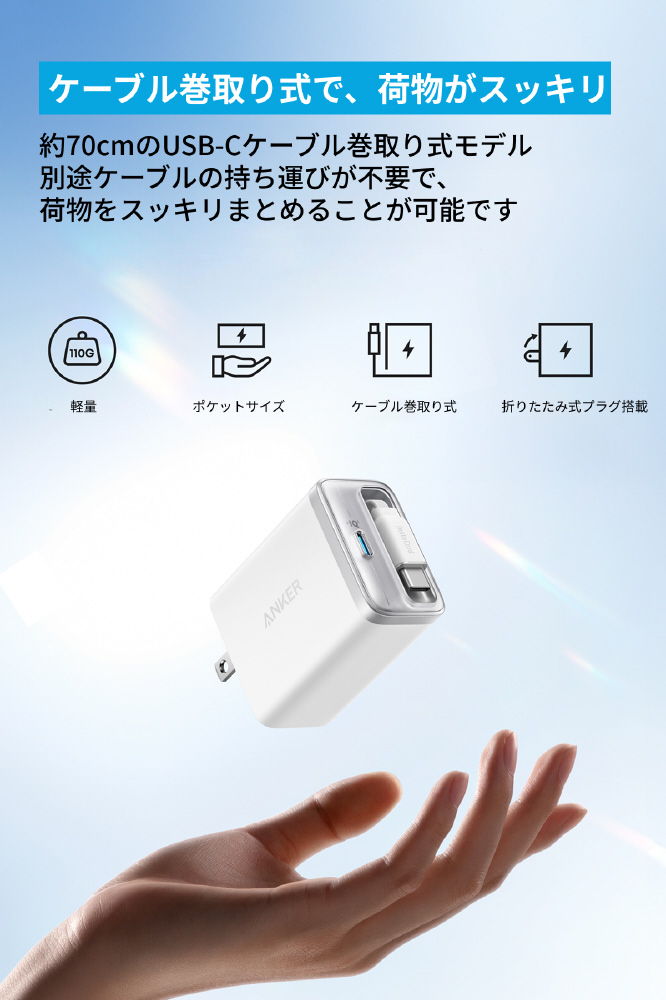 充電器 Anker Nano Charger (35W, 巻取り式 USB-Cケーブル) ホワイト A2658N21 [USB Power Delivery対応 /2ポート]
