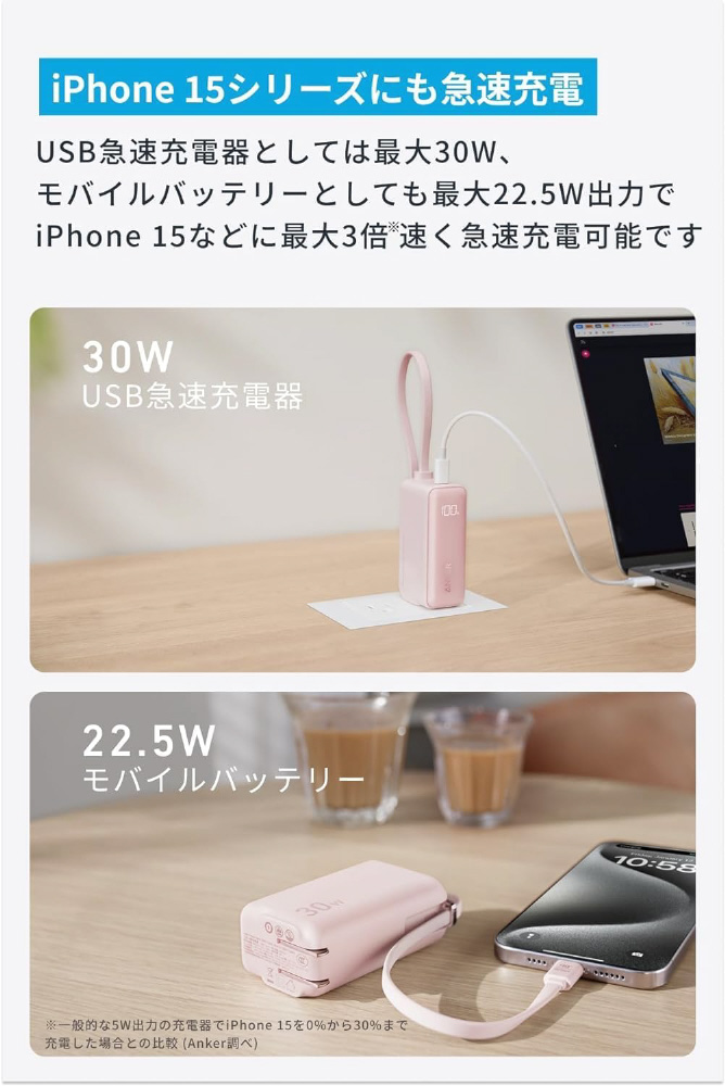 充電器としては最大30W、モバイルバッテリーとしても最大22.5W出力でiPhone 15シリーズにも最大3倍速く急速充電が可能です。また本体表面にはディスプレイを搭載し、バッテリーの残量をリアルタイムかつ一目で確認できます。