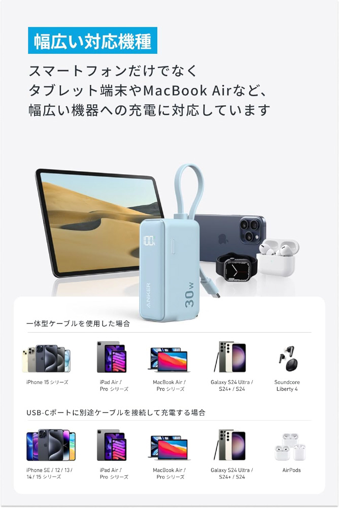 サイズ:約83×50×31mm (プラグ部を除く)、重さ:約200g、容量:5000mAh、入力:AC入力:100V-240V ~ 50-60Hz 1.5A、USB-C入力 / USB-C 内蔵ケーブル入力:5V = 2.1A、出力、急速充電器として使用時:USB-C 出力 / USB-C 内蔵ケーブル出力:5V = 3A / 9V = 3A / 10V = 2.25A / 15V = 2A / 20V = 1.5A (MAX 30W) 合計出力:5V = 3.6A (MAX 18W)、モバイルバッテリーとして使用時:USB-C出力 / USB-C 内蔵ケーブル出力:5V = 3A / 9V = 2.22A / 10V = 2.25A (MAX 22.5W) 合計出力:5V = 3A (MAX 15W)