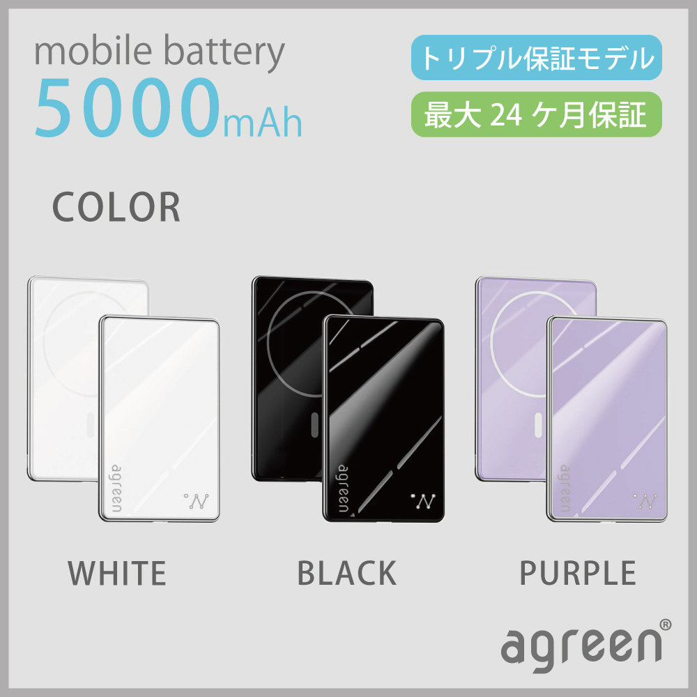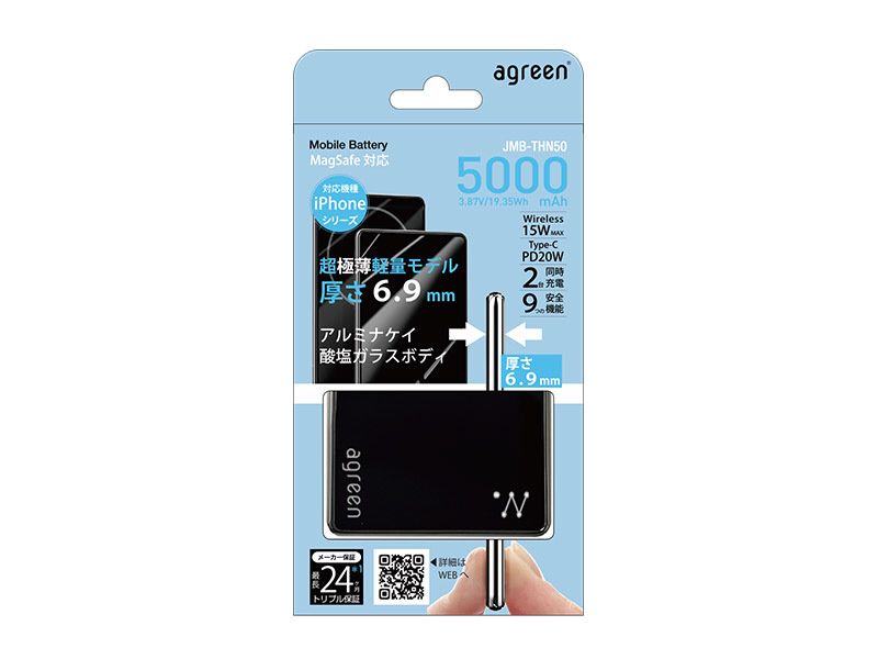 Magsafe対応薄型モバイルバッテリー 5000mAh 超極薄 agreen ブラック JMB-THN50-BK
