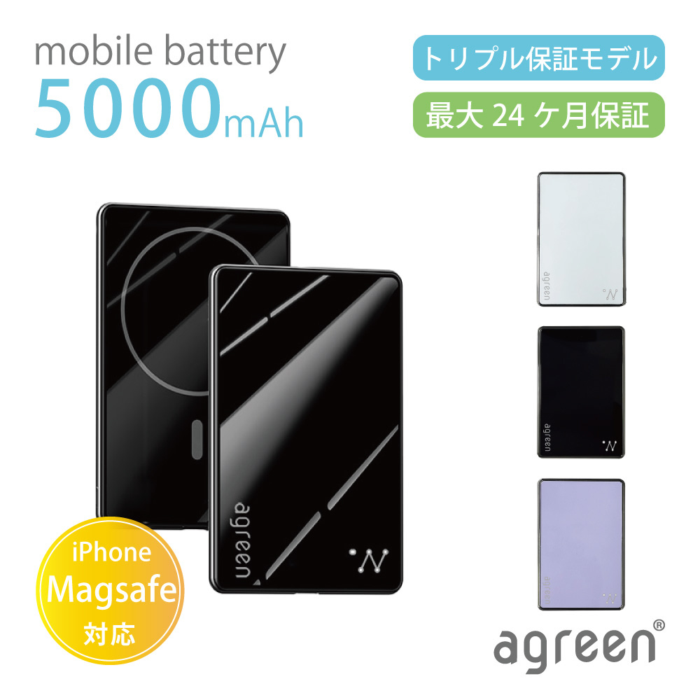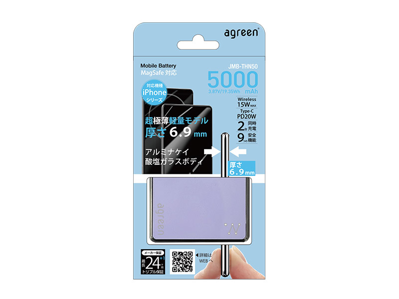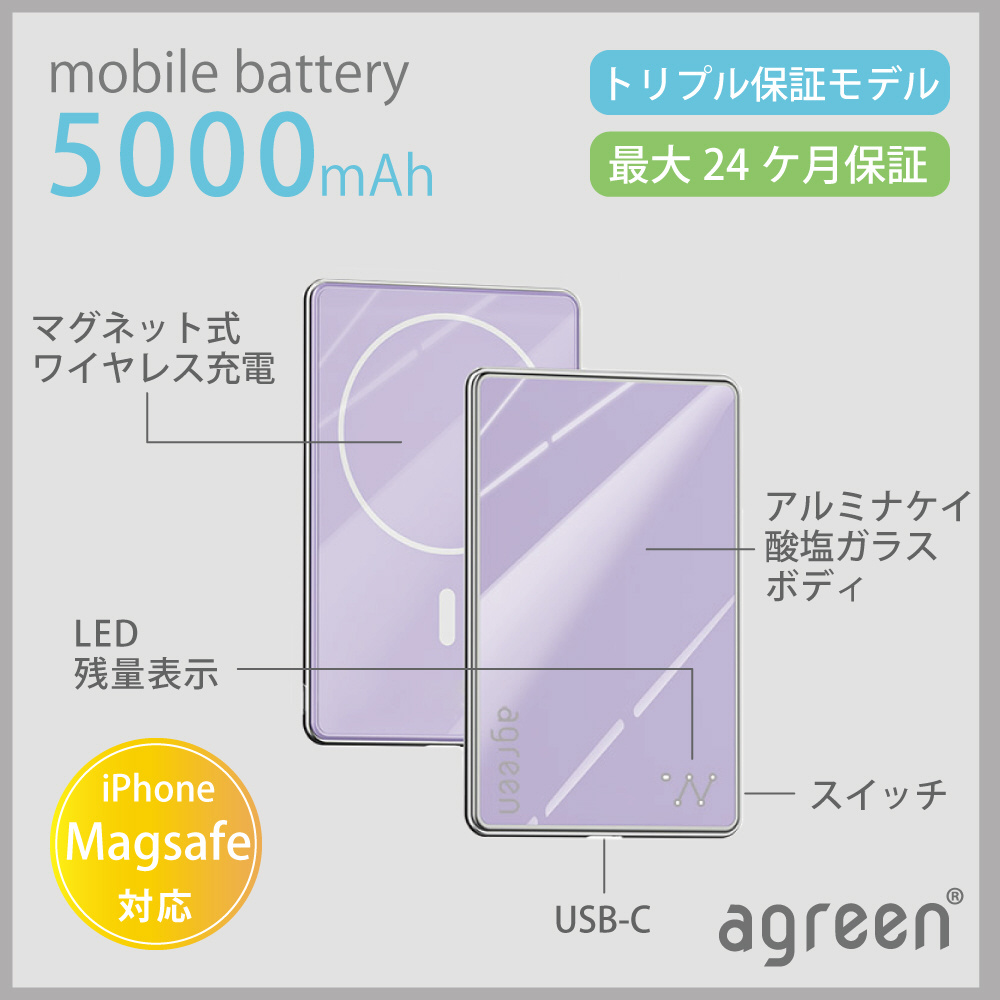 Magsafe対応薄型モバイルバッテリー 5000mAh 超極薄 agreen パープル JMB-THN50-PP