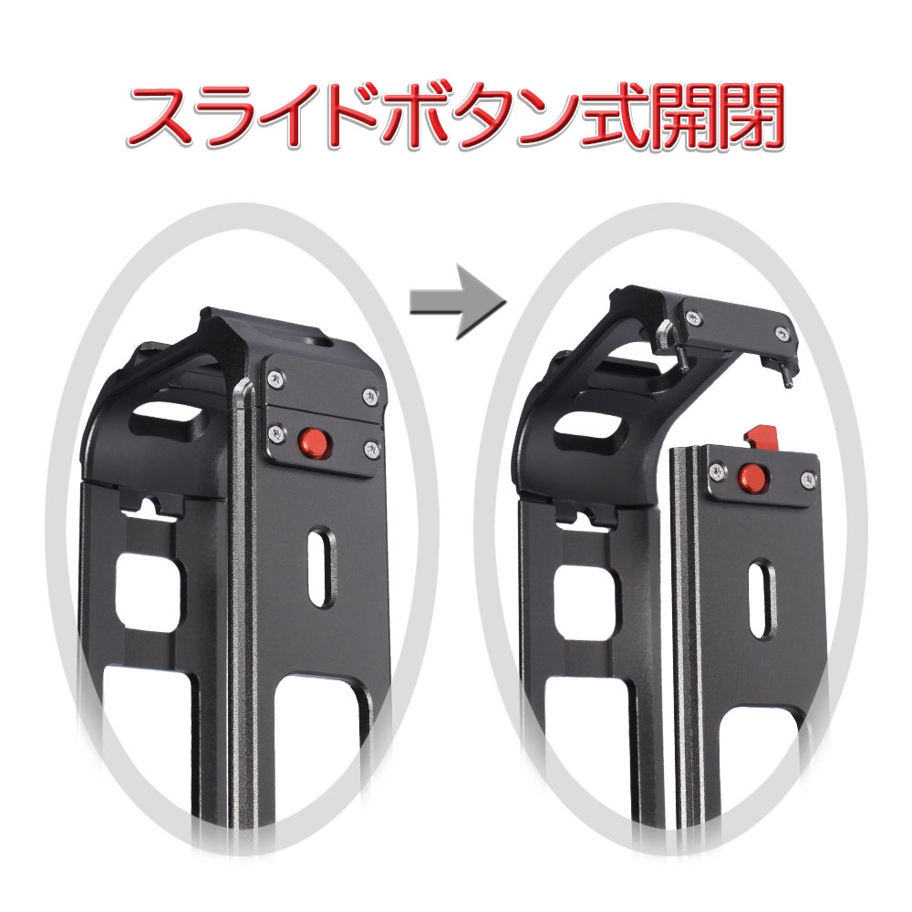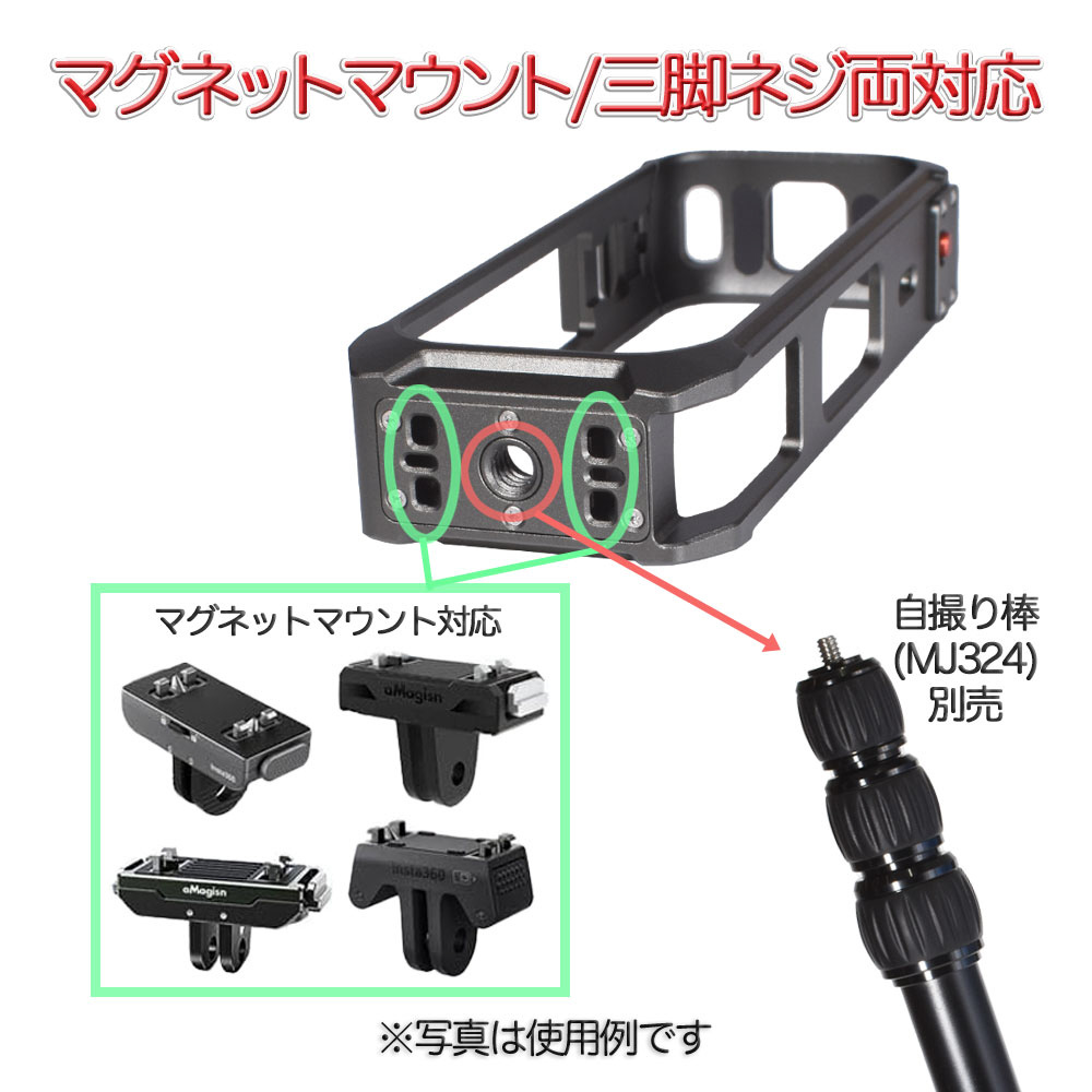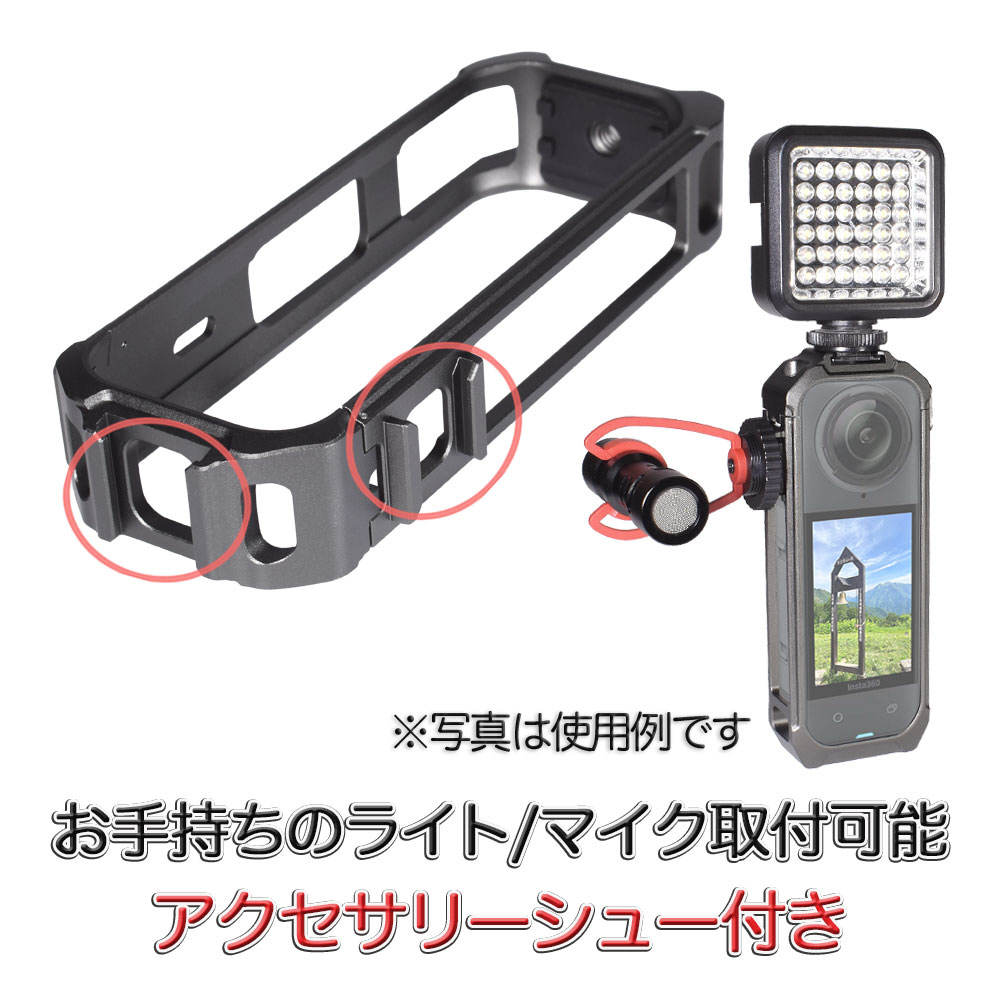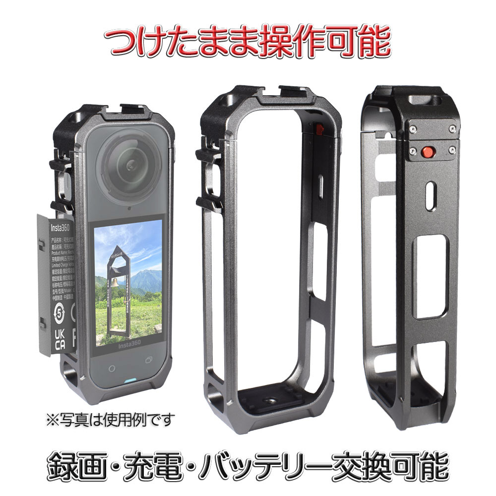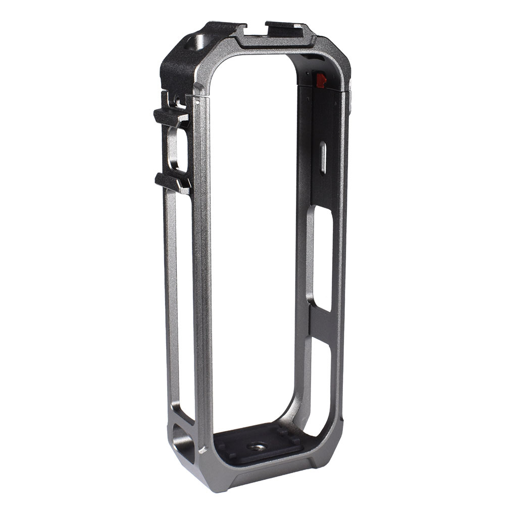 Insta360 X5専用のアルミ合金製フレーム。耐衝撃性に優れ、アウトドアや悪天候下でも安心。スライドボタン式で簡単着脱、幅広いマウントやアクセサリーに対応します。