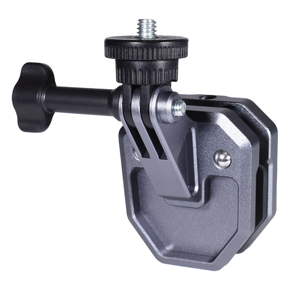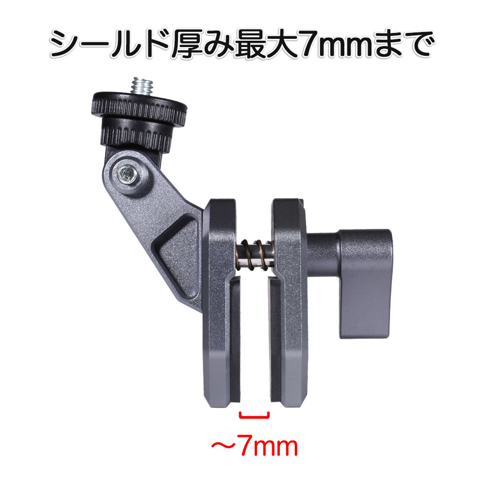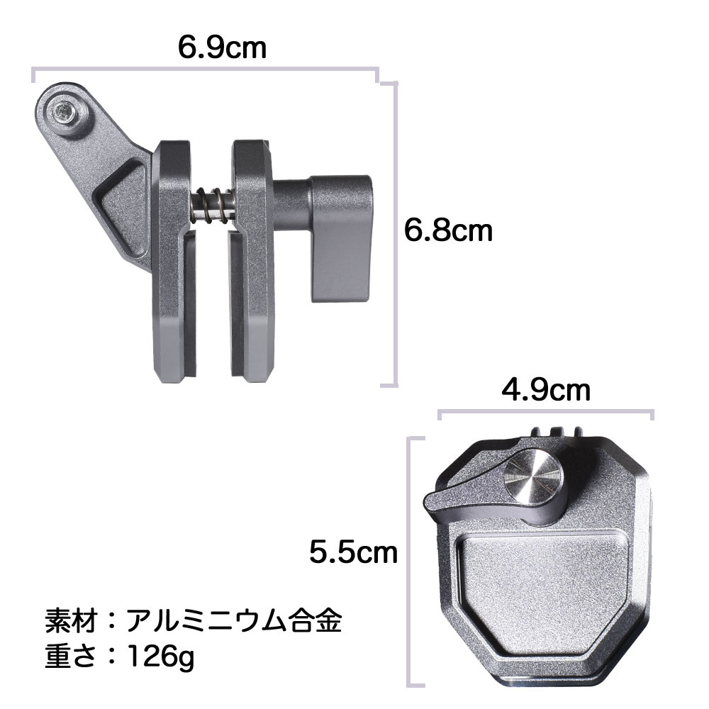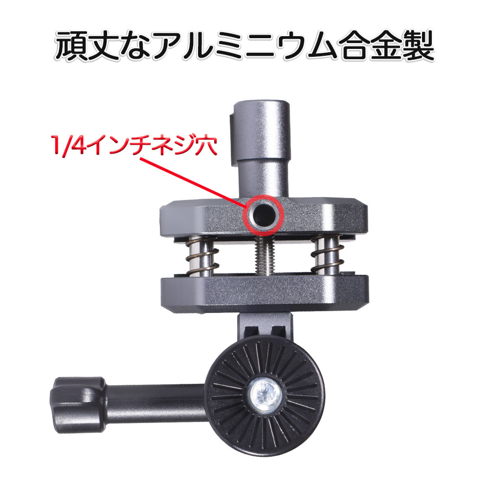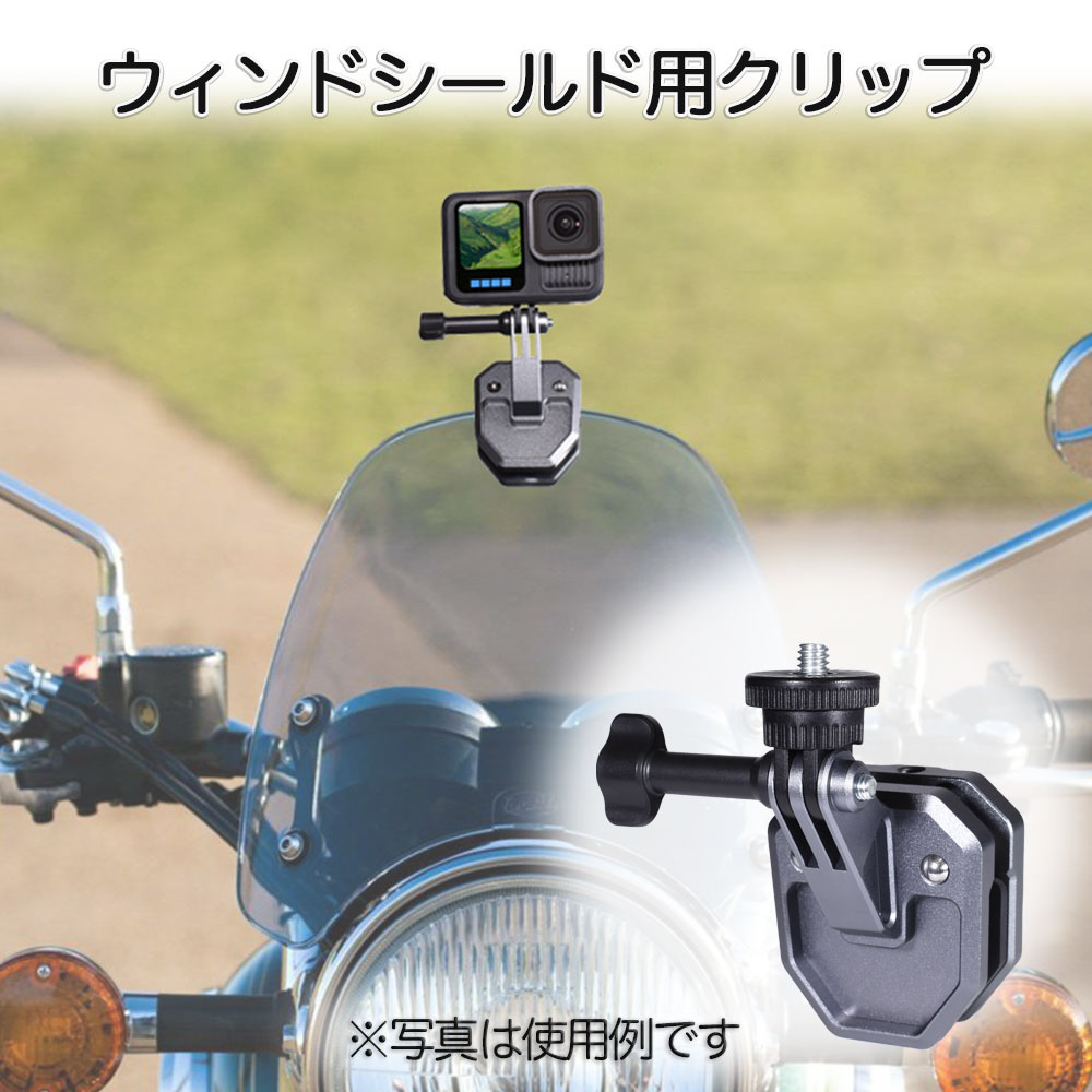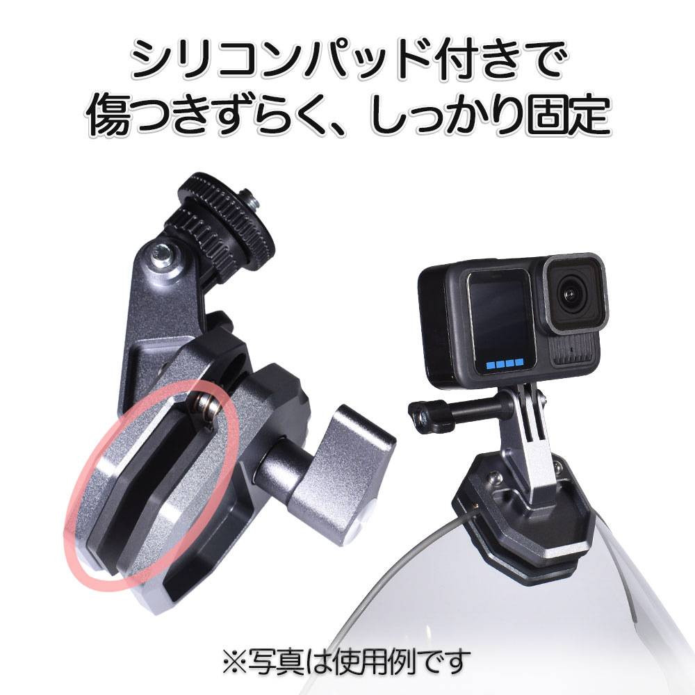 GoPro・DJI・Insta360などのアクションカメラ対応。バイクや電動自転車のフロントガラスに取り付けるアルミクリップマウント。簡単装着で振動軽減、角度調整も自在です。