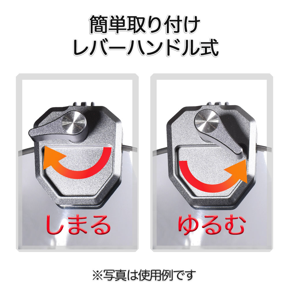 アルミニウム合金製の丈夫な本体に、レバー式のクリップを採用。工具不要で素早く取り付け・取り外しが可能です。