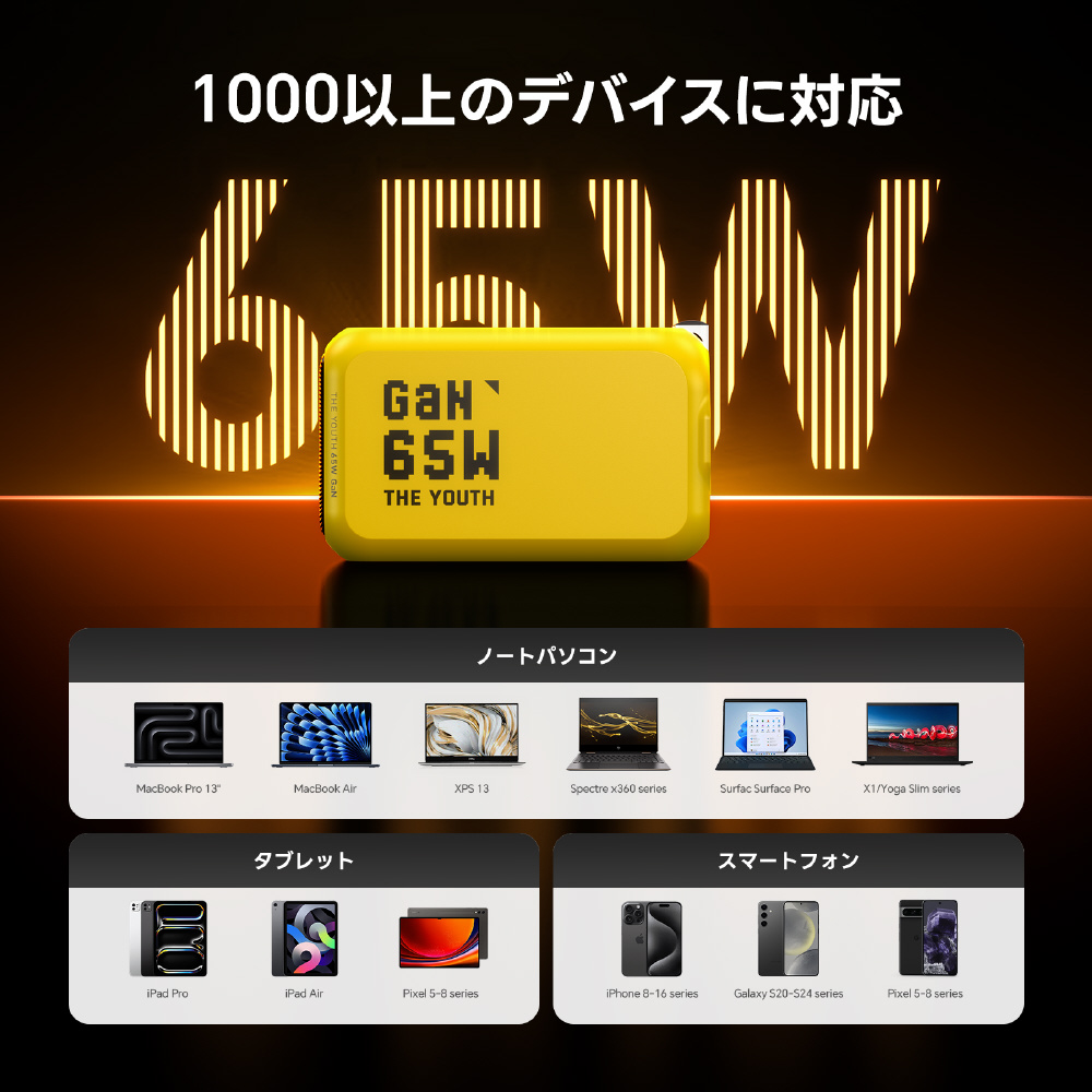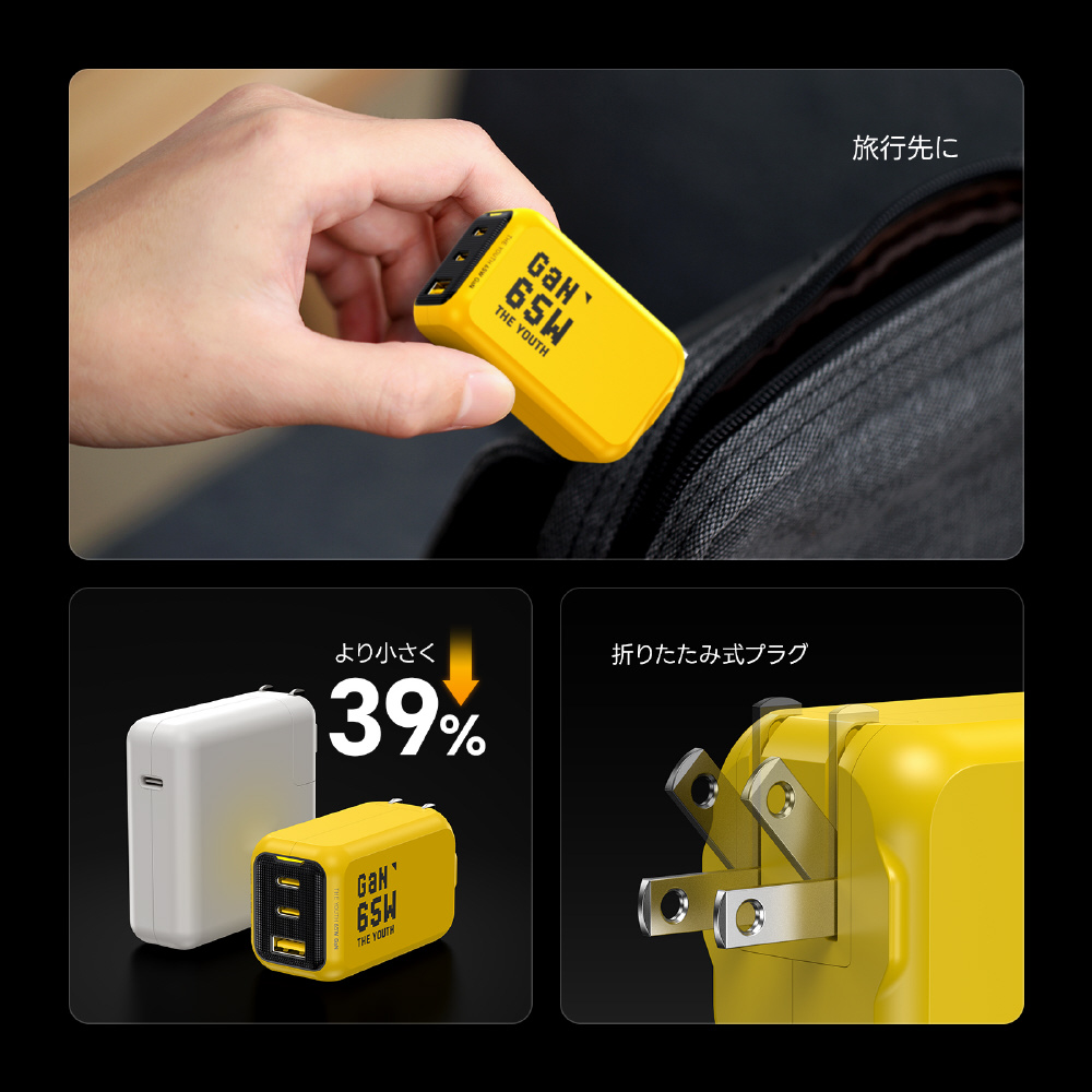 THE YOUTH PD ケーブルセット 65W USB C×2ポート USB A×1ポート PC/タブレット/携帯電話 65W急速充電 ブラック RE-JEYTP65BL2