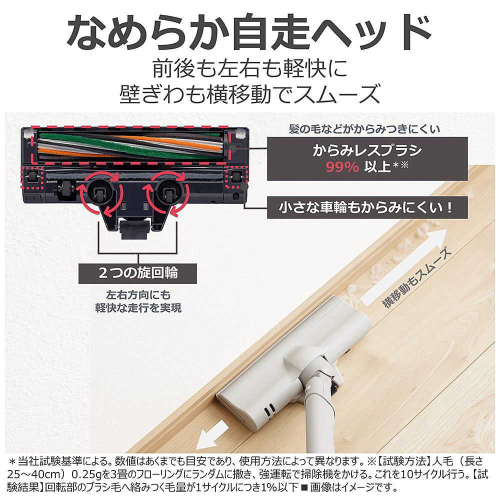 ・「なめらか自走ヘッド」で滑るようにキレイ。壁際も横滑りで一気にゴミが取れます。