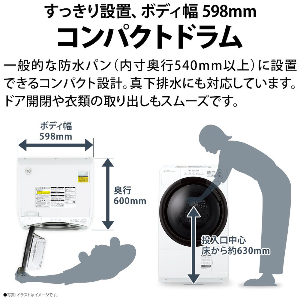 ボディ幅598mmのスリムでコンパクトなデザイン。一般的な防水パン(内寸奥行540mm以上)に設置でき、真下排水にも対応しています。ドア開閉や衣類の取り出しもスムーズに行える、使いやすいサイズ設計です。