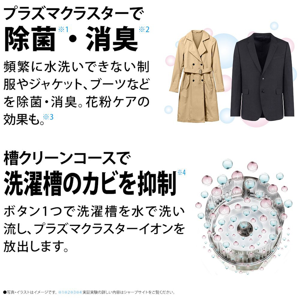 ※1 ・試験機関: (一財)日本食品分析センター ・試験方法:菌を付着させた試験布の菌の除去率を測定(洗濯〜乾燥運転3kg) ・除菌方法:プラズマクラスターおよび洗濯〜乾燥運転による ・対象部分:ドラム内の衣類 ・試験結果:洗濯〜乾燥運転で菌を99%以上抑制 ・イオン濃度:約300000個/m3(ドラム中央部) ・試験機種:ES-S7E(2019年度モデル、ES-7S1と同等)