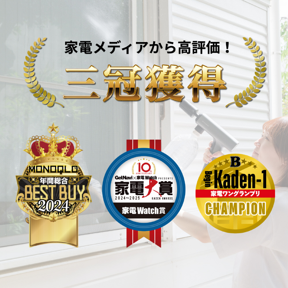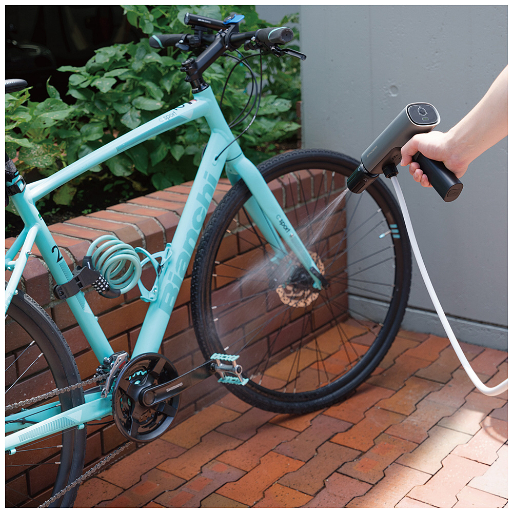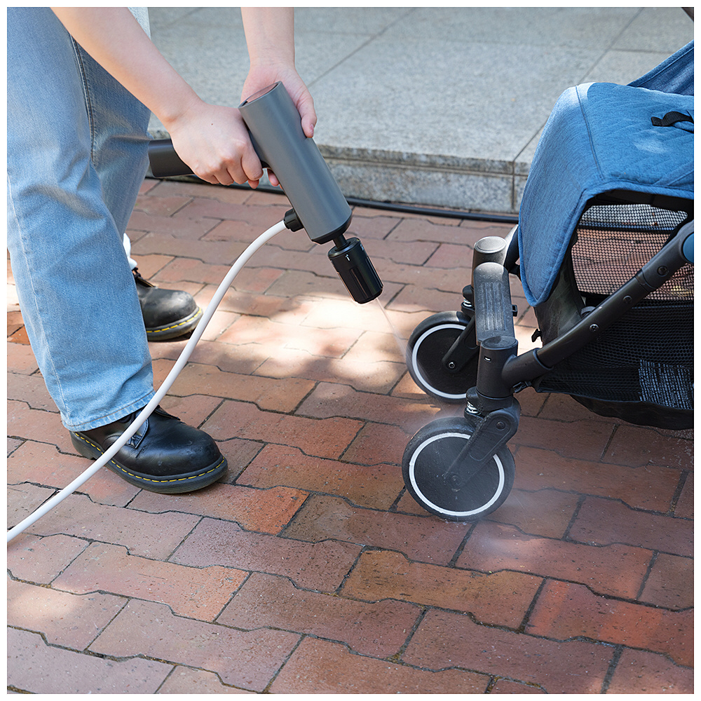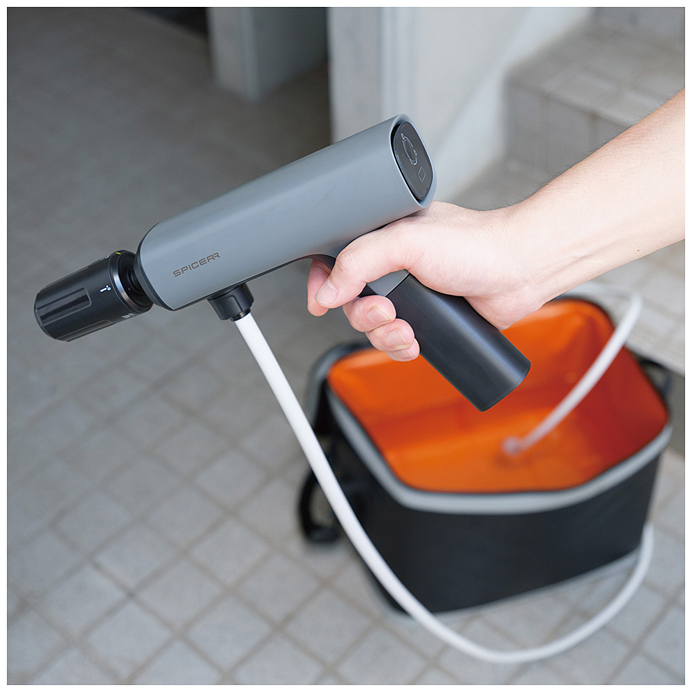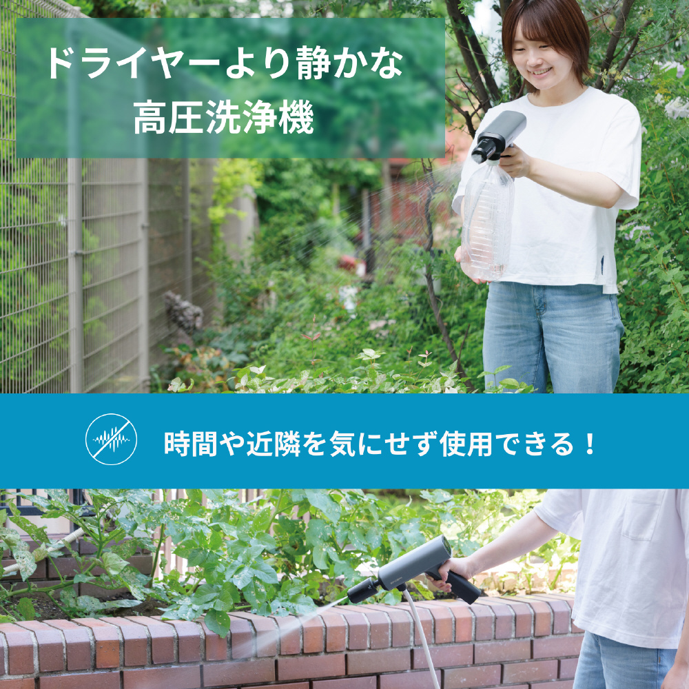充電式でコンセントとケーブルの長さなどを気にせず使用することができ、バケツからホースまたはペットボトルを装着することで水栓いらず。場所を選ばない洗浄が可能です。