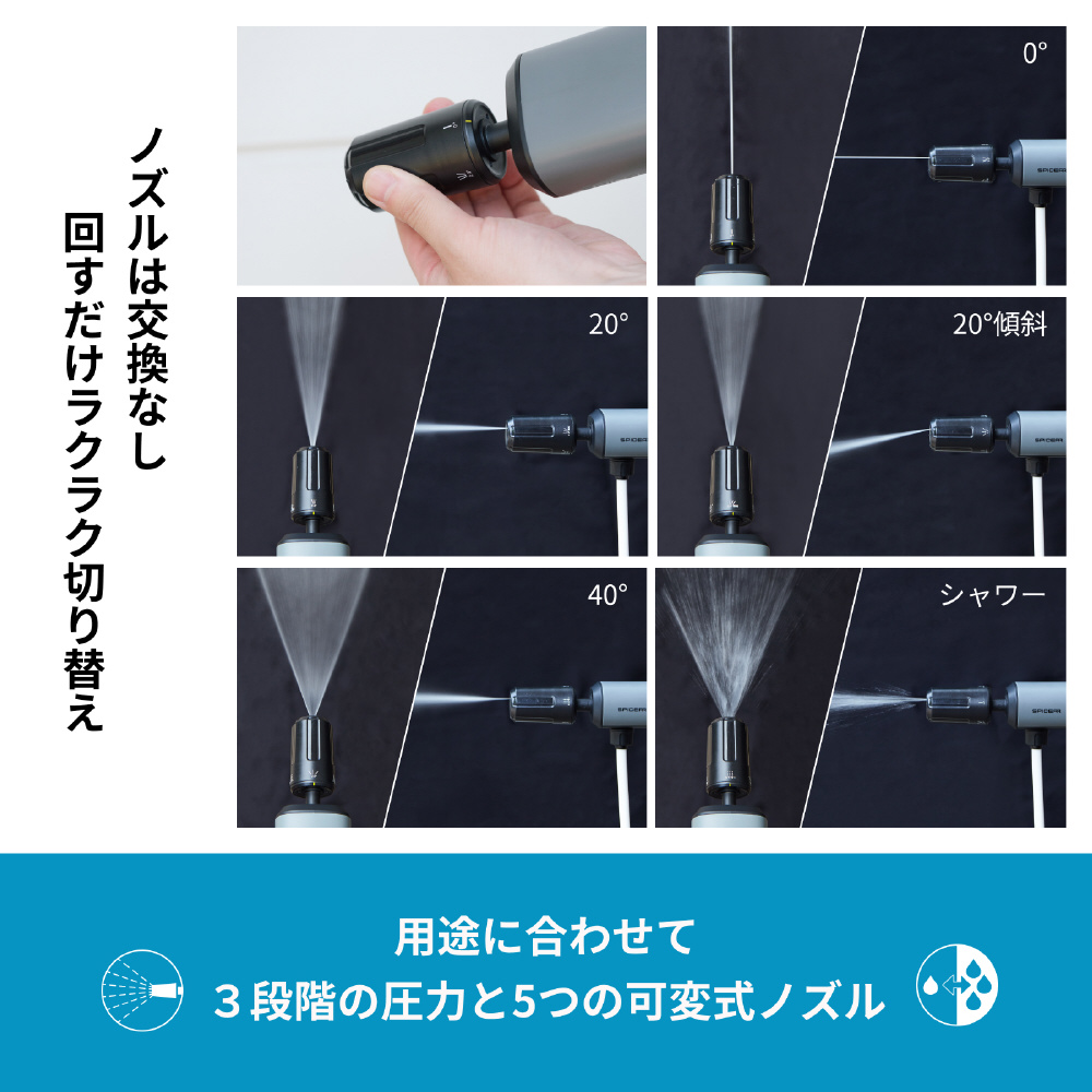 付属のノズルで5パターンの噴射、ボタンにより3段階の調整ができます。網戸にはワイドな40°、花の水やりには「弱」タイヤの泥を洗うのは「強」など洗浄するシーンや形状に応じて強度やノズルを変更して使用できます。