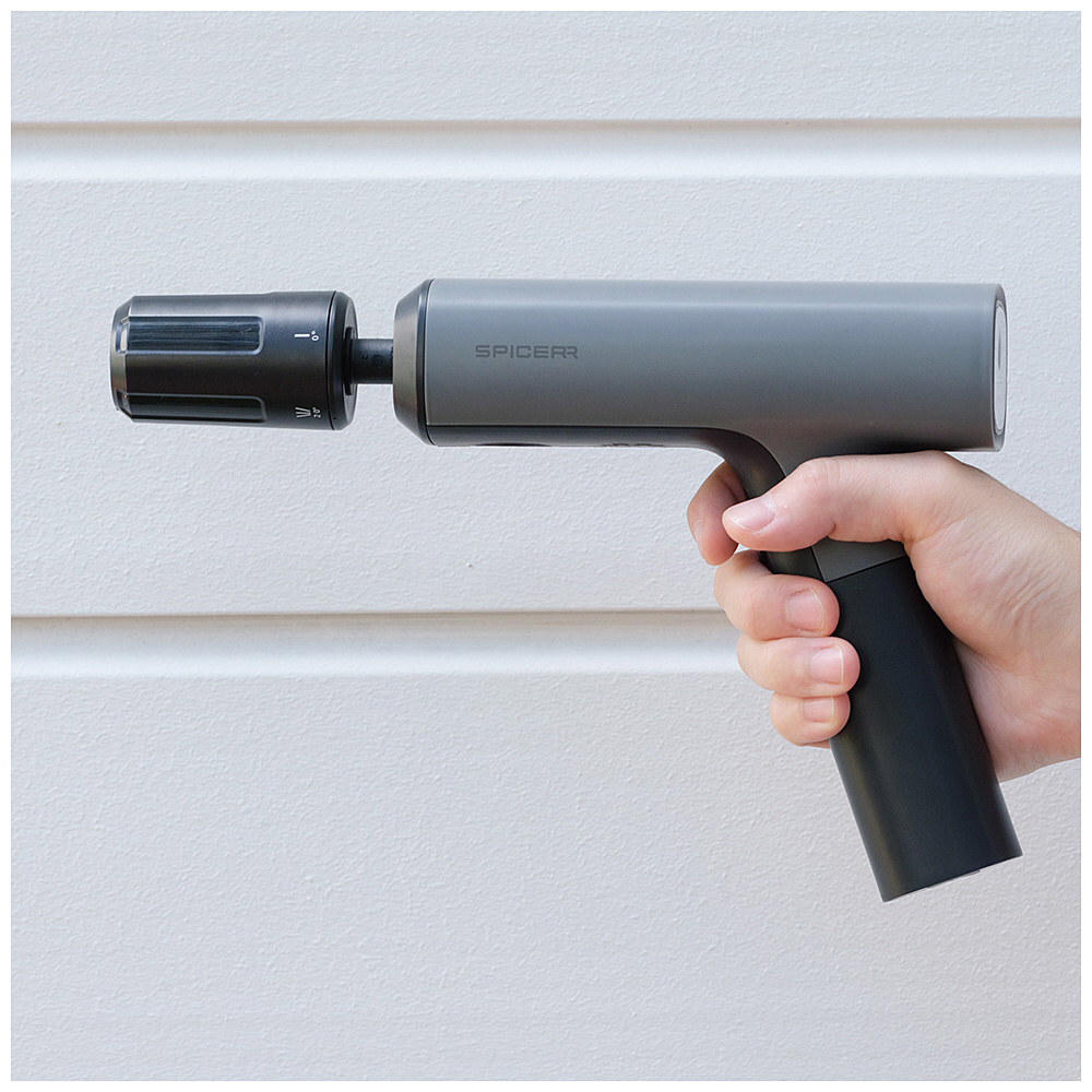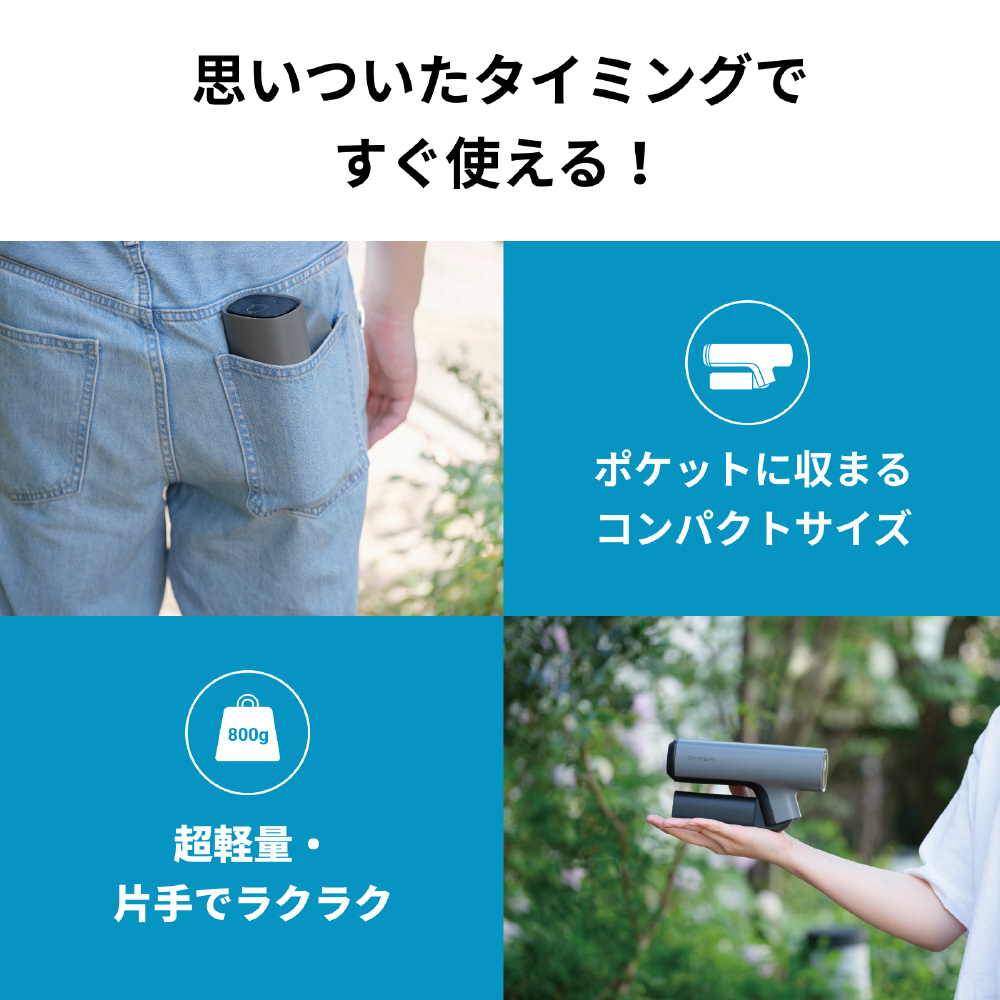 折りたたむとホ゜ケットに入るほどのサイズ感、800gと女性でも軽く扱える重量で手軽に使用ができます。また折りたたむことでトリガースイッチが隠れるなど誤作動防止の機能も担っています。