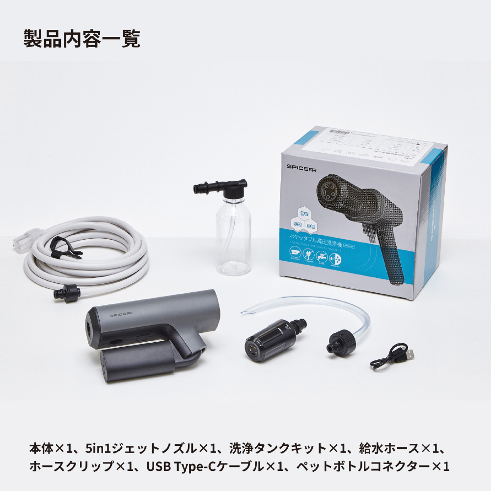 付属品 5in1ジェットノズル、洗浄タンクキット、給水ホース(5m)、ホースクリップ、USB Type-Cケーブル、ペットボトルコネクター