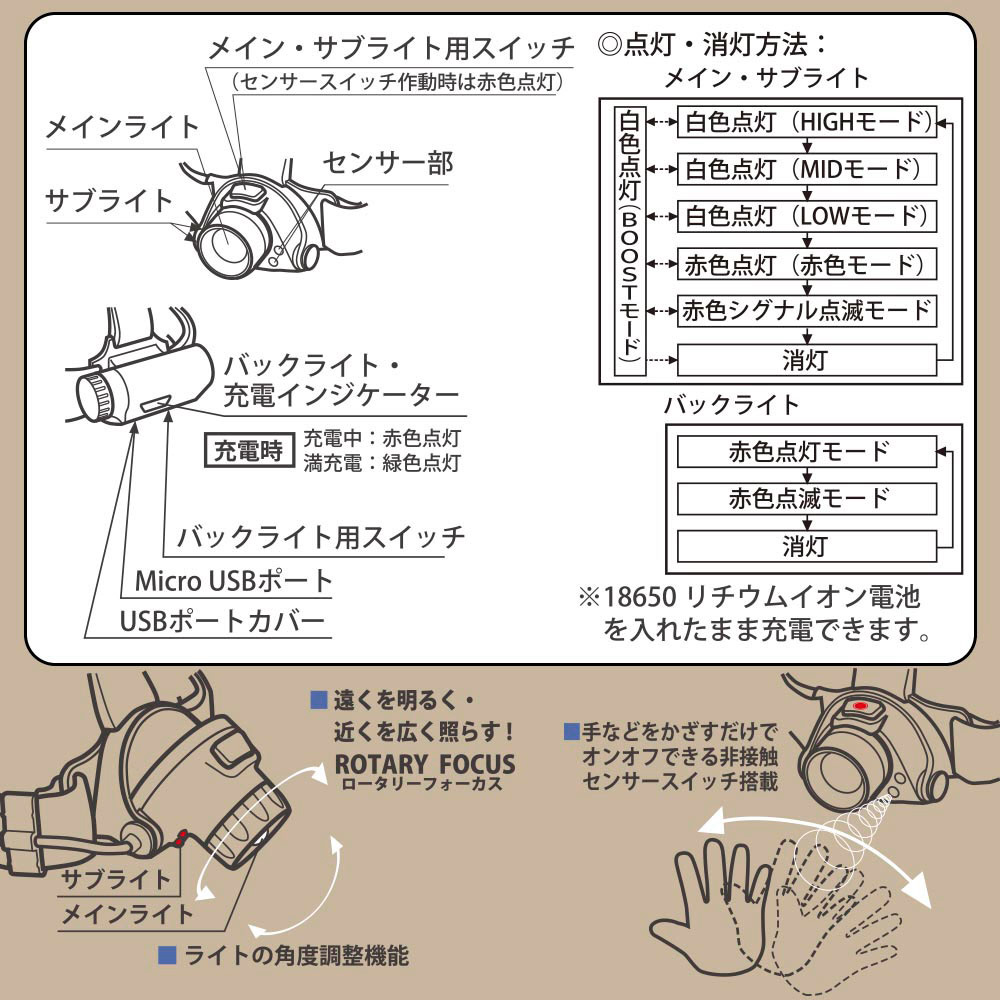 付属品 ヘッドバンド、USBケーブル、18650リチウムイオン電池(3.7V 2200mA)