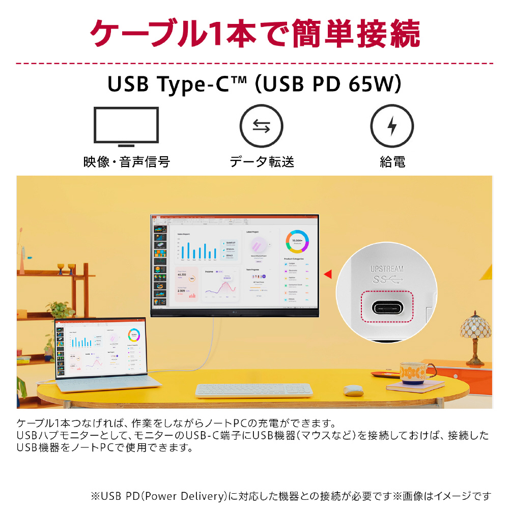ケーブル1本で映像・音声信号、データ転送、給電*(65Wまで)が可能なUSB Type-C端子を搭載。お手持ちのノートパソコンも簡単にセットアップ。USB Type-C接続なら、作業をしながら、ノートパソコンの充電もできます。また、USBハブとして、モニターのUSB Type-C端子にUSB機器(マウスなど)を接続しておけば、接続したUSB機器をノートパソコンで使用できます。また、パソコンを接続していないときは、webOSの操作に使用できます。より少ないケーブルでデスク環境を構築できるので、デスク周りもスッキリきれい、デスク環境がより理想に近づきます。