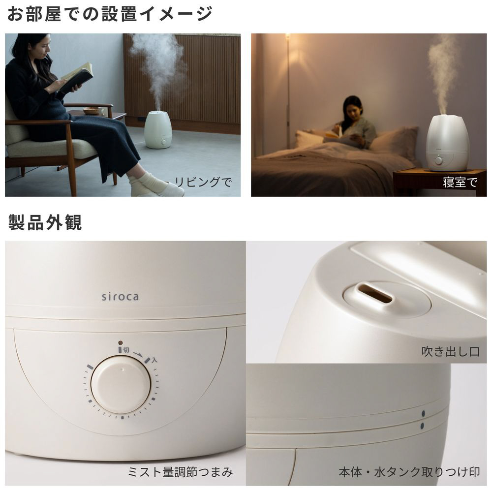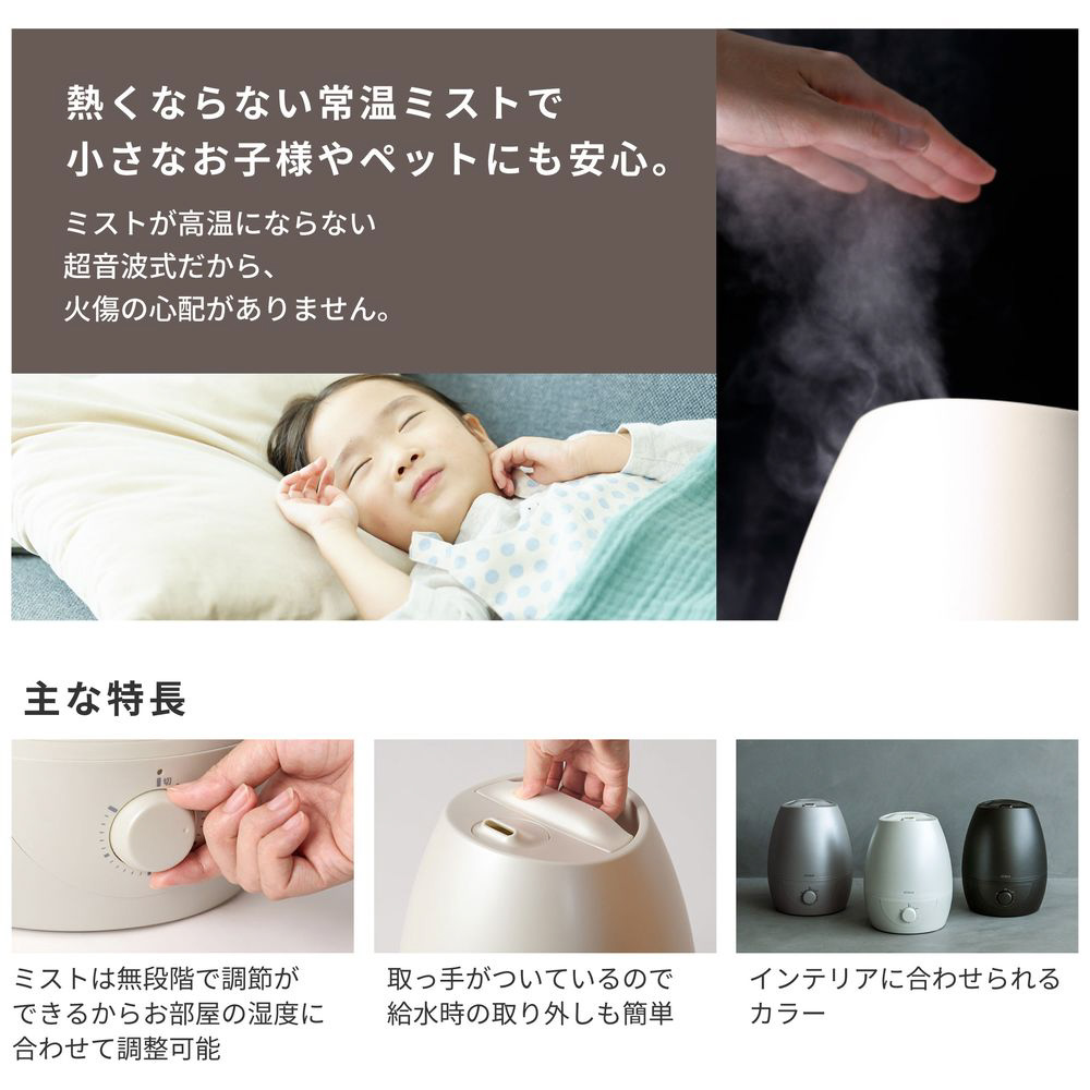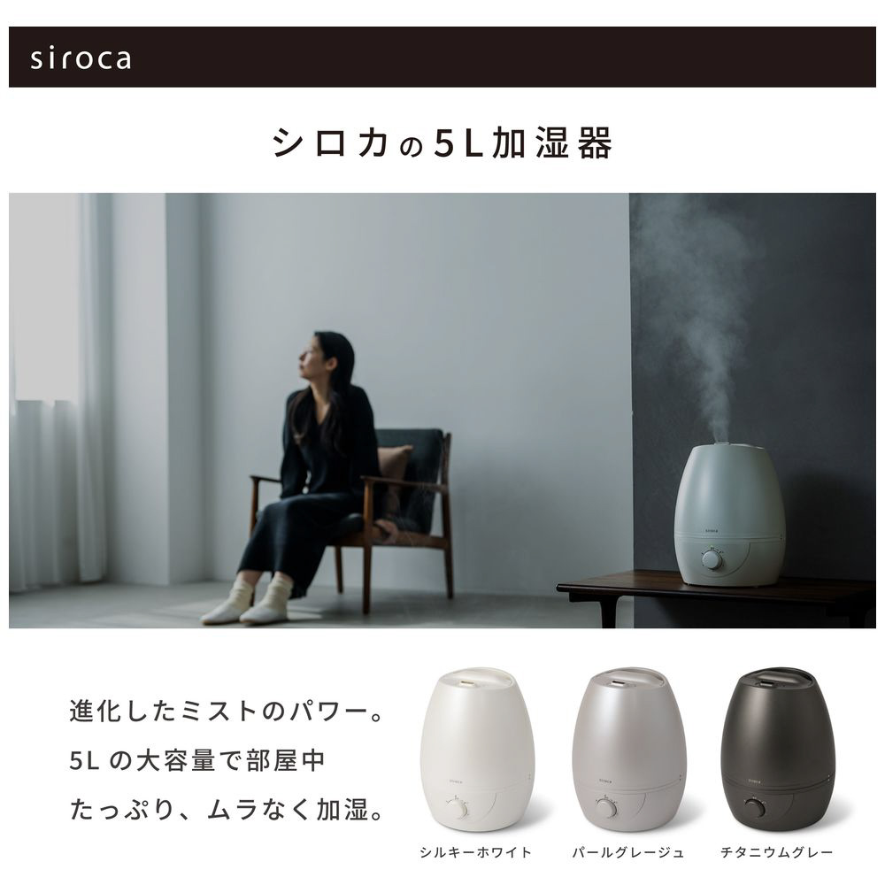 シロカの5L加湿器は水に超音波を当てて振動させることでミストを発生させる「超音波式」。熱くならない常温のミストで加湿するため、火傷の心配がありません。