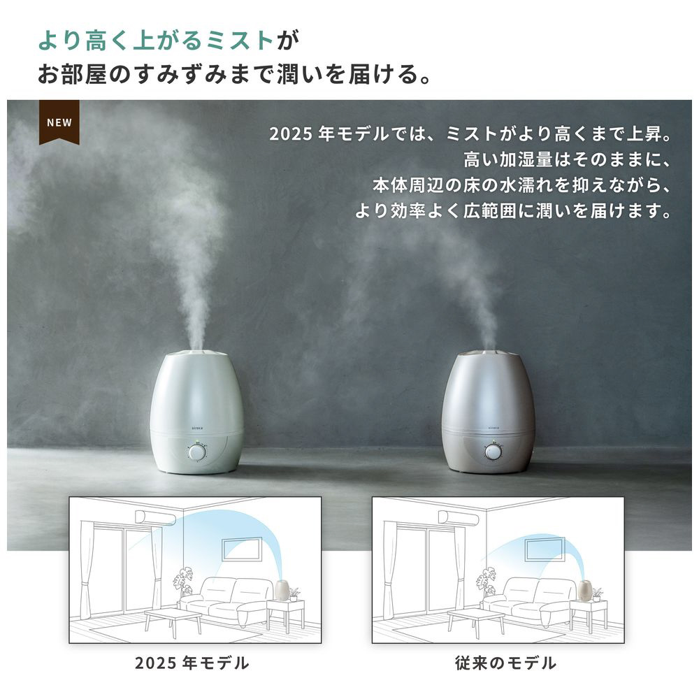 ミストを高くまで上げることで床など本体周辺の水濡れを抑え、効率よくパワフルに加湿できる一台です。