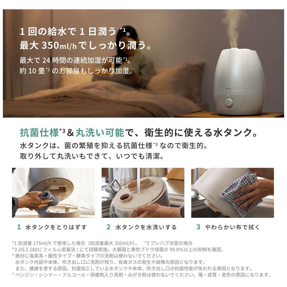 最大加湿量は350ml/h。加湿量は無段階で設定できるため、お部屋の広さや湿度に応じて調整してお使いいただけます。